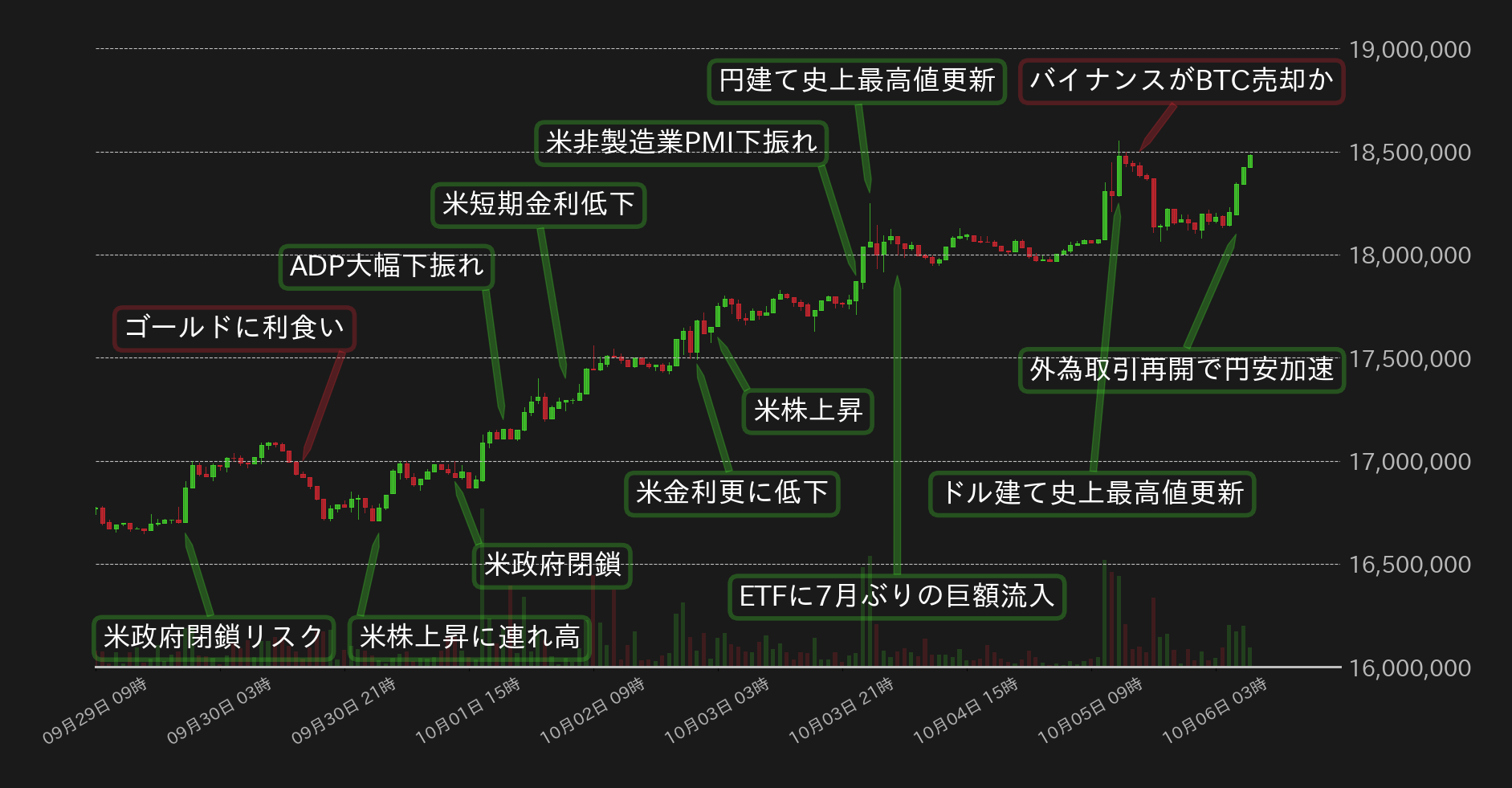 米政府機関の閉鎖と利下げ期待により、先週のBTC円は1700万円を回復すると、その後はドル安と米金利低下が続くなか上昇一色となった。3日に全米供給管理協会(ISM)が発表した9月の非製造業PMIが市場予想を下回ると、相場は更に上昇し1800万円を回復。8月14日に付けた史上最高値1824万円を更新した。