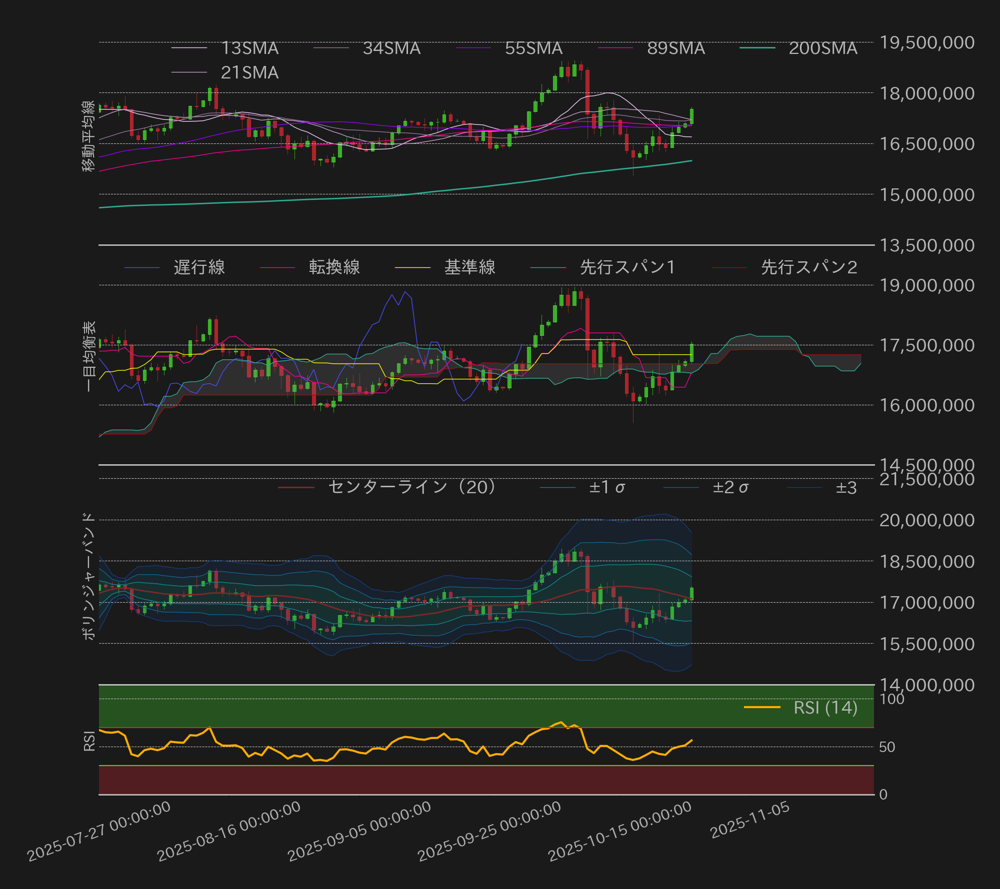 26日には、米中閣僚級通商協議でレアアースの輸出規制やフェンタニル問題など多くのトピックで合意の枠組みができたと伝わり、1740万円まで上昇。今朝方、シカゴマーカンタイル取引所(CME)のBTC先物が取引を再開すると、1750万円を突破した。