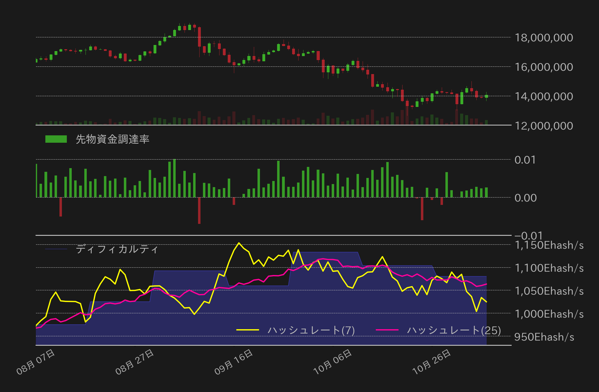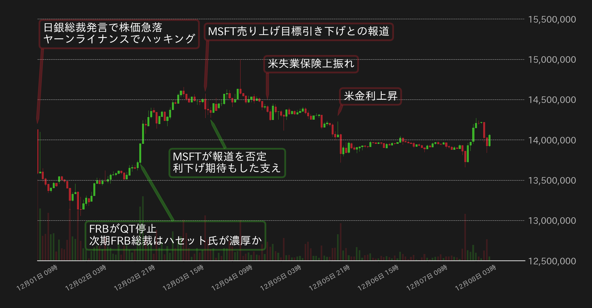 7日米国時間から不安定な推移となるも、1400万円周辺を維持し、週足終値ベースではほぼ変わらずとなった。