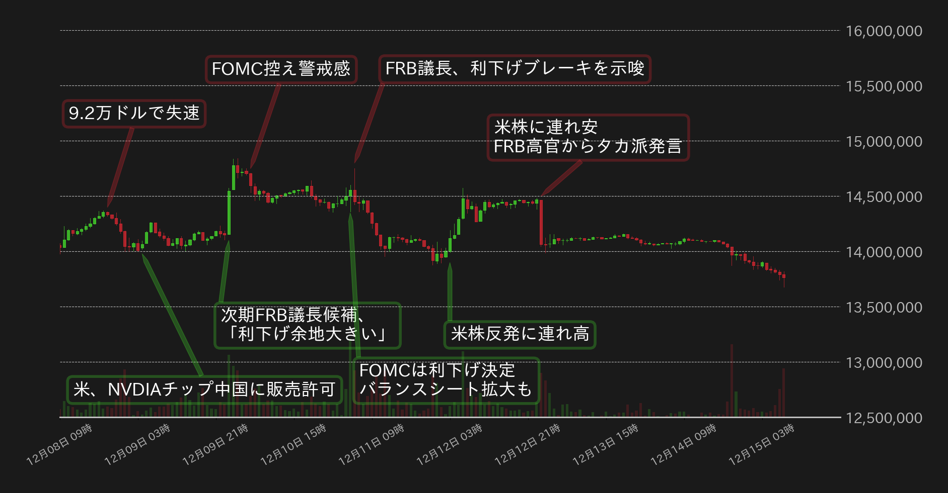 ただ、FRBのメディア・ブラックアウト期間が明け、12日には利下げに反対票を投じたシカゴ連銀のグールズビー総裁や、カンザスシティ連銀のシュミッド総裁からタカ派的な発言が相次ぎ、米債利回りの上昇がBTC相場の重石となり、結局、1400万円近辺まで反落した。