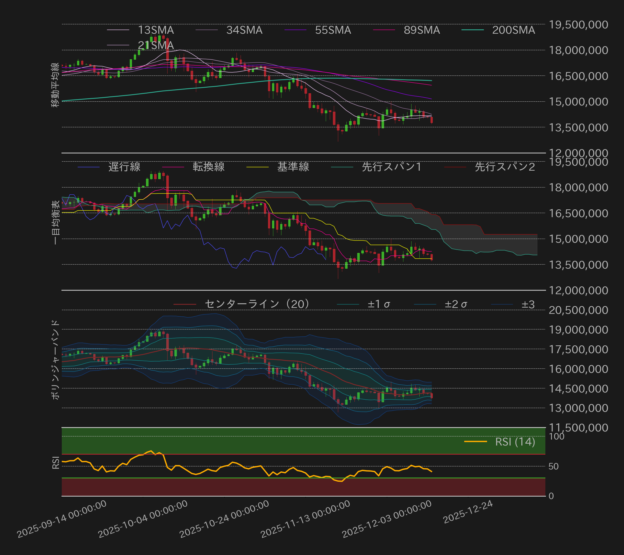 今年最後のFOMCを控え、1450万円周辺で揉み合っていたBTC円だが、パウエルFRB議長が来年にかけて政策スタンスの様子見姿勢をとる可能性を示唆したことで、相場は1400万円周辺まで反落した。一方、金利の見通しが維持されたことや、バランスシートの拡大が再開されることとなり、翌11日の米国時間には下げ幅を縮小し、その後は1450万円手前の水準で上げ渋る展開となった。