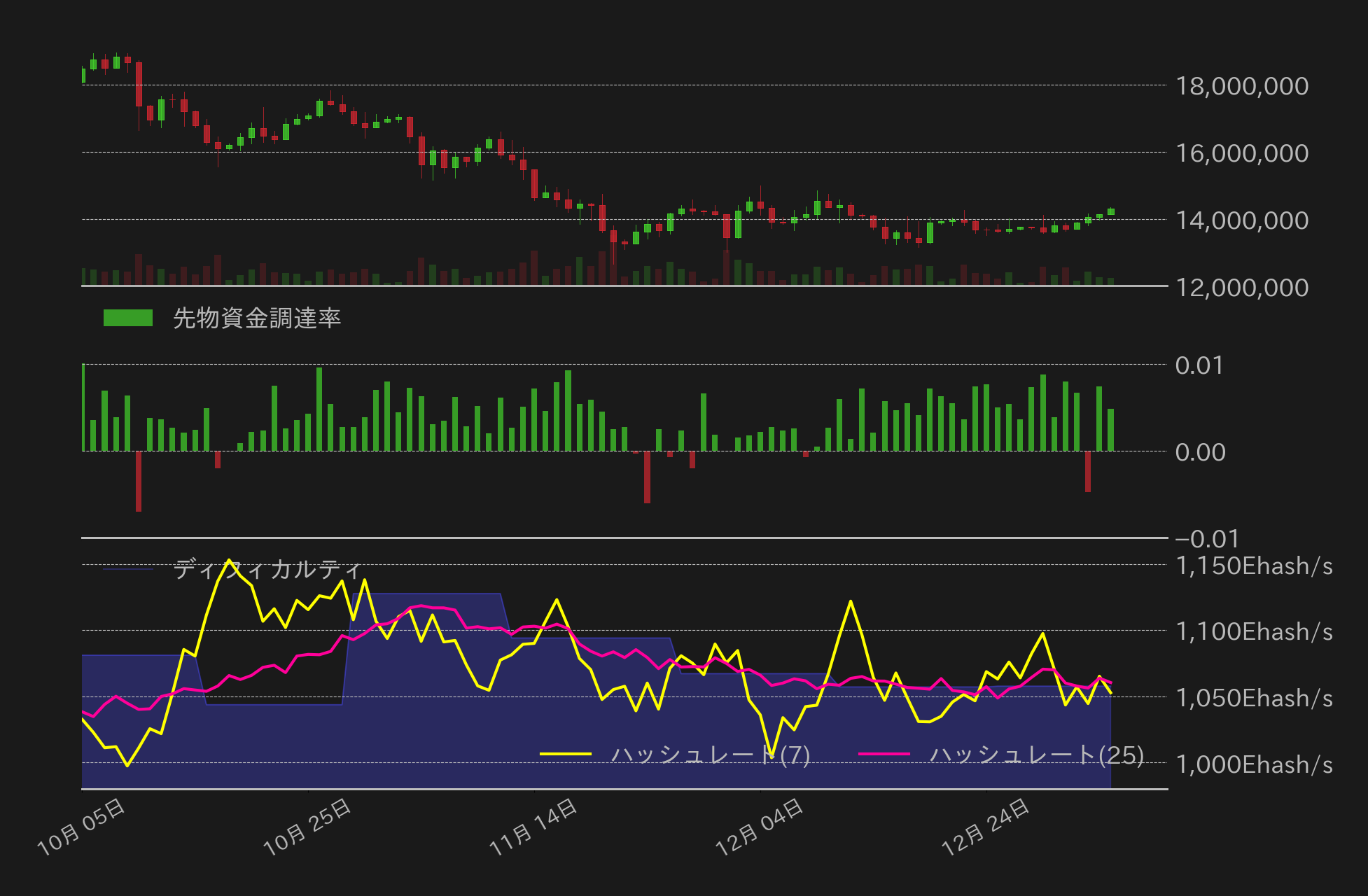 12月29日〜1月4日のビットコイン(BTC)対円相場の週足終値は、前週比56万5000円(4.11%)高の1431万5000円と反発した。