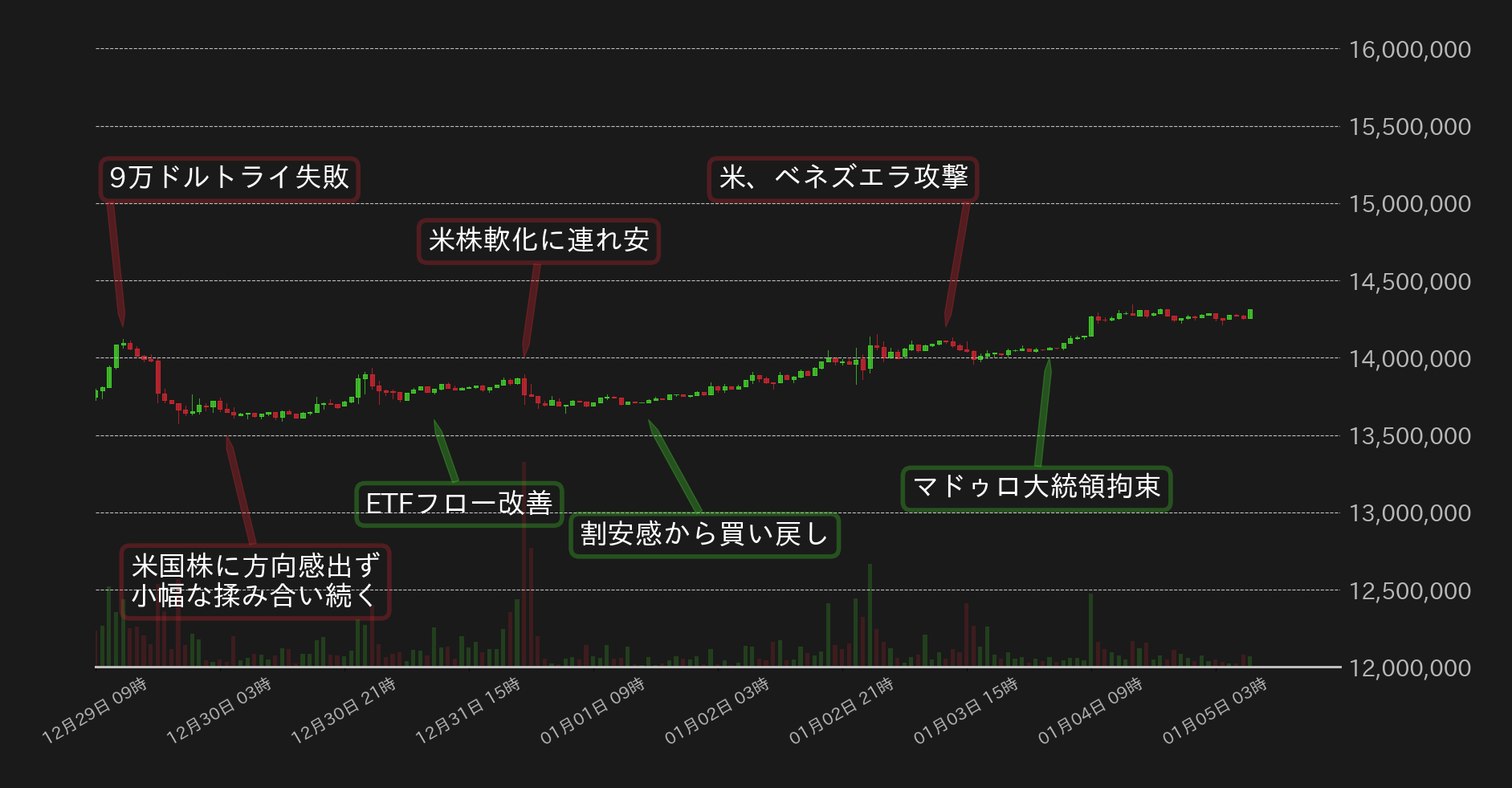 3日には、米国軍がベネズエラで軍事作戦を展開し、相場は一時弱含むも、米国軍がマドゥロ大統領を拘束したと伝わると、徐々に戻りを試す展開となった。週明けの金融市場では地政学リスクの台頭による波乱を懸念する声も散見されたが、マドゥロ大統領拘束によって事態が急転直下で収束したこともあり、4日のBTC相場は1430万円近辺まで上昇し、ドル建てでは節目9万ドルを回復した。