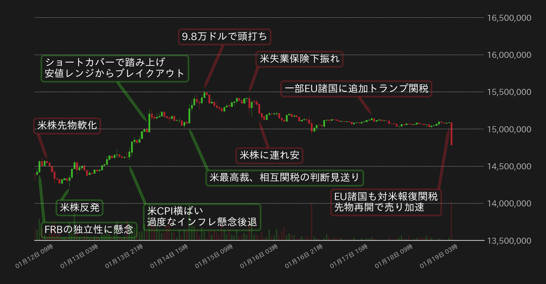 週末の相場は1500万円を維持したが、トランプ米政権がグリーンランド買収に反対する一部EU諸国に対して追加で10%の関税を賦課すると発表すると、EU諸国も対米報復関税措置を発表したことで、先物の取引が再開したと同時に売りが膨らみ、1500万円の維持に失敗した。