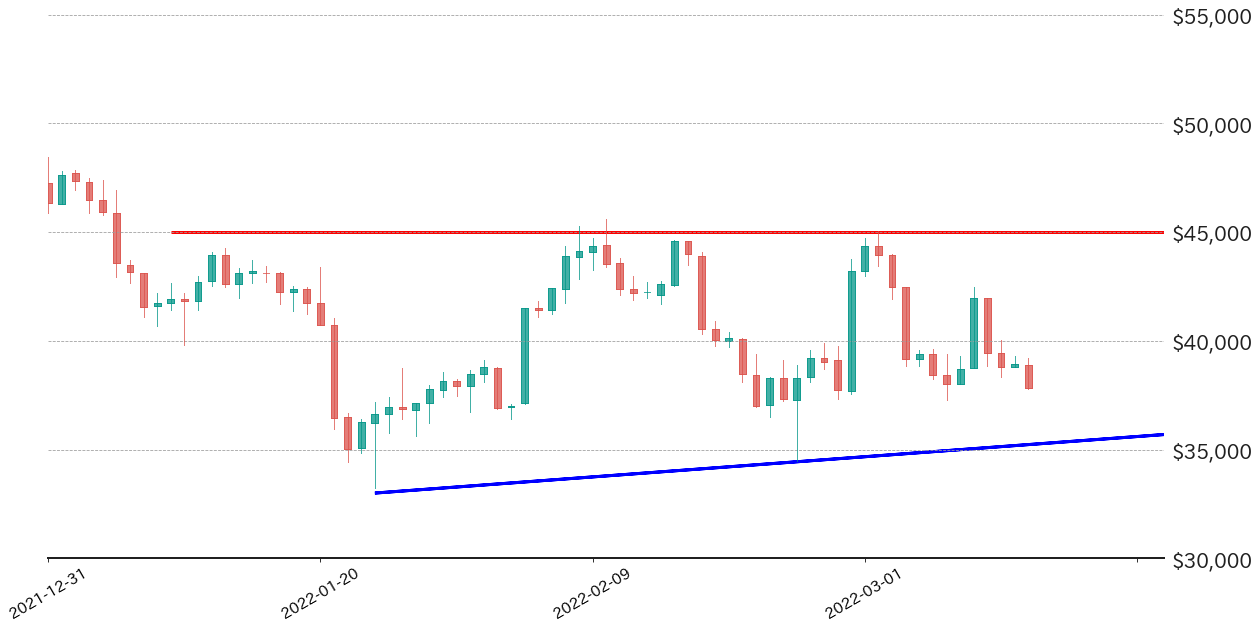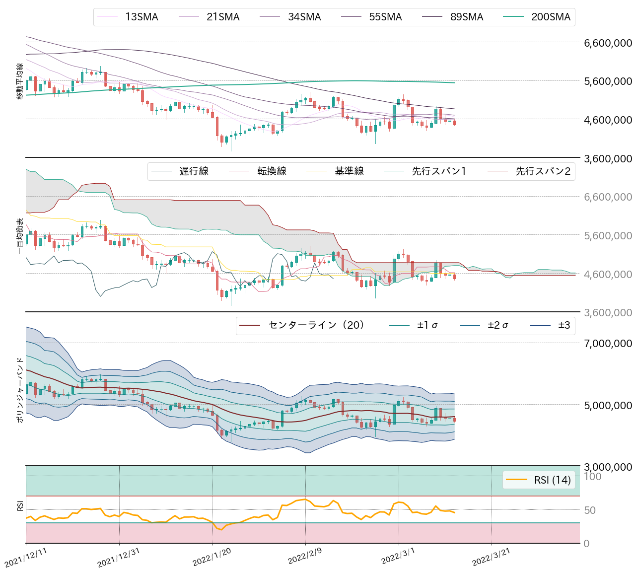 7日の米市場では、米国のロシア産石油輸入停止が決まり原油価格が高騰。これを受けて米株が大幅続落となる中、BTCも下げ足を速め、430万円にタッチしたが、コモディティ価格高騰によるインフレと消費減少による景気後退が同時に起こるスタグフレーション懸念が台頭し、期待インフレの急上昇とそれに伴う実質金利の低下を受けてか、BTCは同水準から反発。翌8日にはロシアがウクライナ首都キーフ(キエフ)を含む5つの都市で停戦するとの報道もあり、再び450万円をトライした。