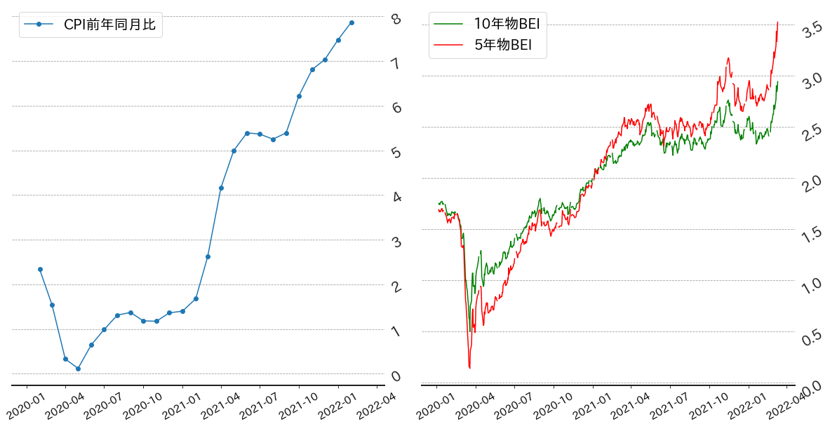 先日行われた議会証言でもパウエル議長は25bpの利上げを支持していたが、2月消費者物価指数(CPI)の上昇(7.5%→7.9%)や期待インフレ(BEI)の高値更新を受けてFOMCメンバーの物価に対する懸念は一層強くなっている可能性も指摘される(第2図)。ウクライナでの戦争の影響を受けて、主要国中銀が緩和縮小ペースを緩めるとの観測も上がっていたが、先週は欧州中央銀行が緩和ペース加速を決断した。その背景にもインフレ加速への懸念があり、今週のFOMC会合でも同様の理由でタカ派的なサプライズが出る公算は排除し切れないだろう。利上げ幅に多くの注目が集まっている印象を受けるが、経済見通しで年末時点の政策金利着地地点及び利上げ回数がどれだけ引き上がるかも注視したい。