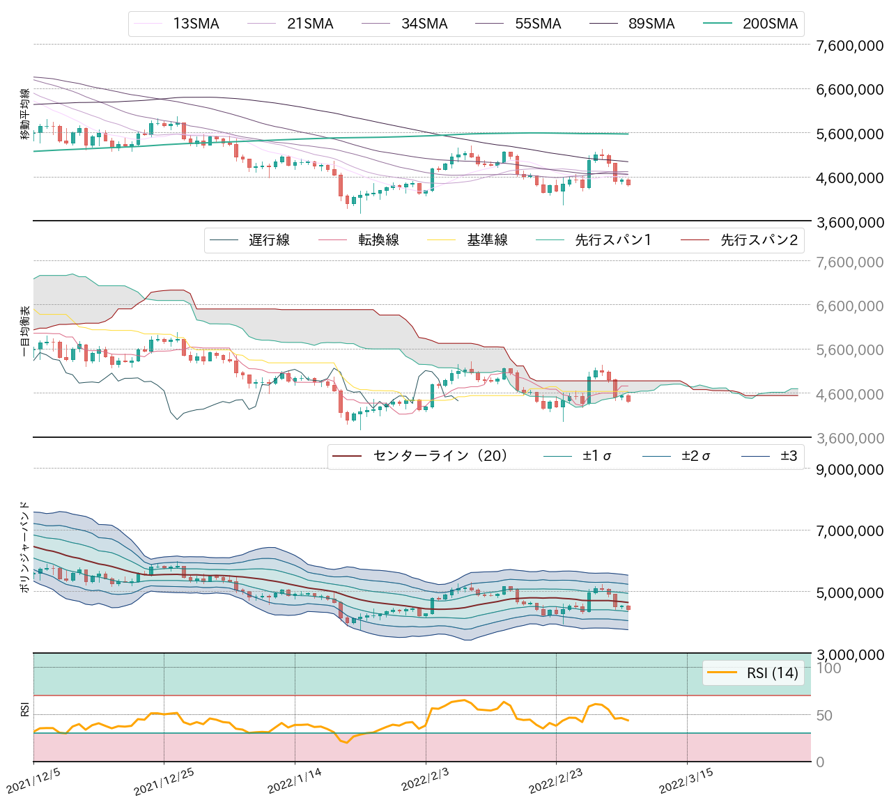 バイデン米政権がロシア中銀との取引停止と資産凍結を発表したことで、ルーブル防衛失敗による暗号資産(仮想通貨)への資金流入が想起され、BTCは28日、米市場寄付き前に440万円周辺から急伸し、対ドルで節目40,000ドルとなる460万円の上抜けに成功。この日行われたロシア・ウクライナの第1回目停戦協議は、目星い成果こそなかったものの次回協議の余地を残して終わったことが安心感に繋がり、BTC相場は一気に500万円まで上値を伸ばす展開を繰り広げた。