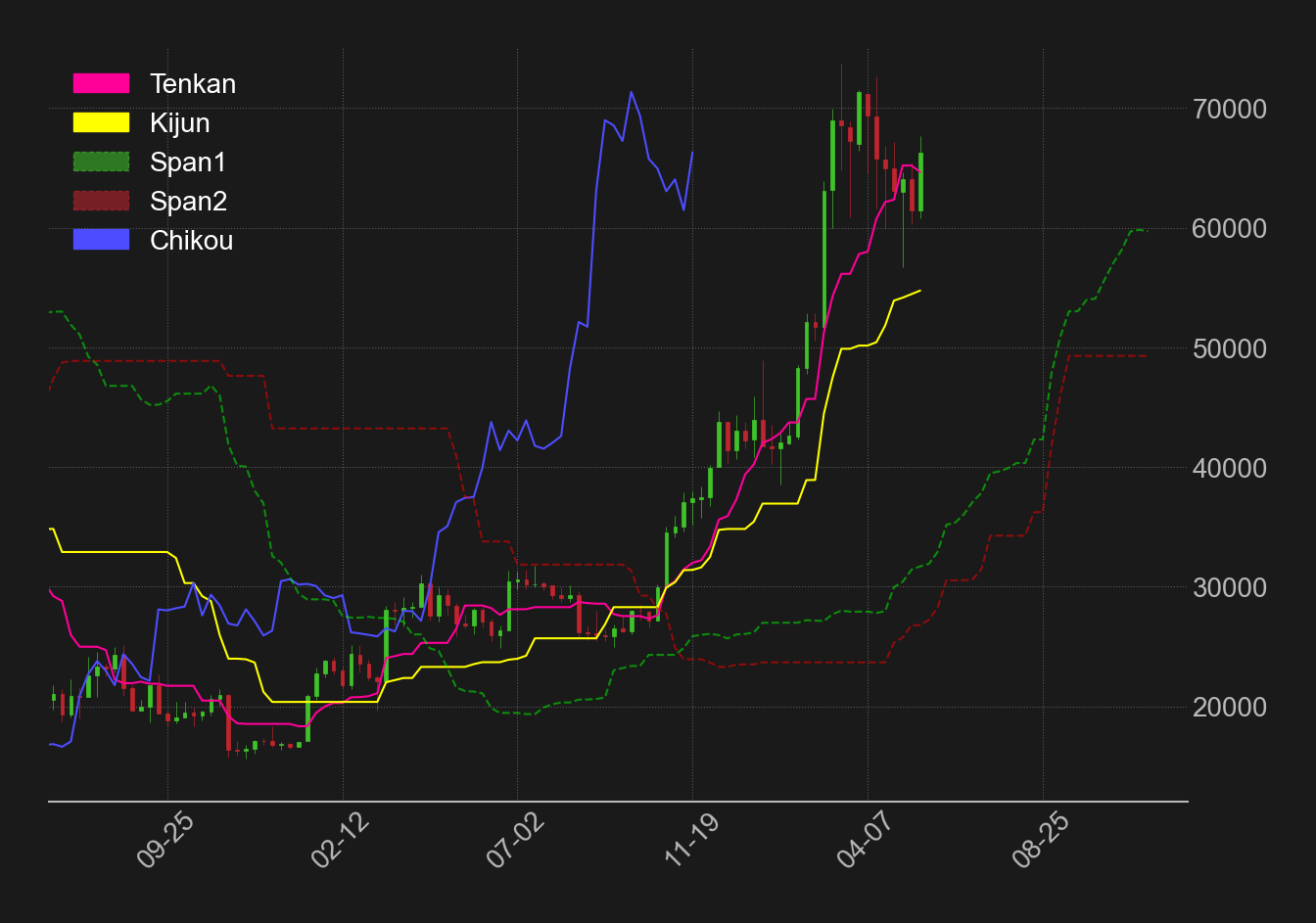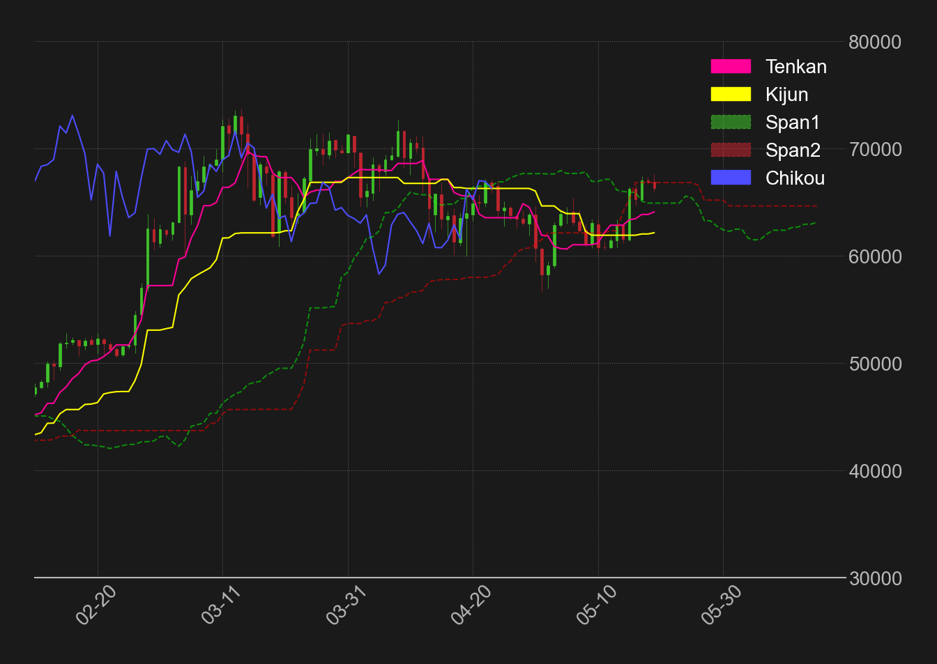 また、足元では遅行線の相場実体上抜けと相場の雲上抜けが直近となっており、三役好転が完成するかが注目される。