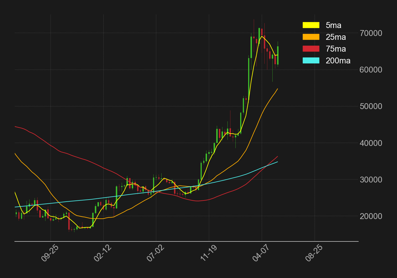 BTCドル週足の移動平均線は、75週線が200週線を上抜き強気のパーフェクトオーダーが出現。下向いていた5週線も下げ止まり、相場は同移動平均線を上回り、短期的な地合いも改善し始めている。