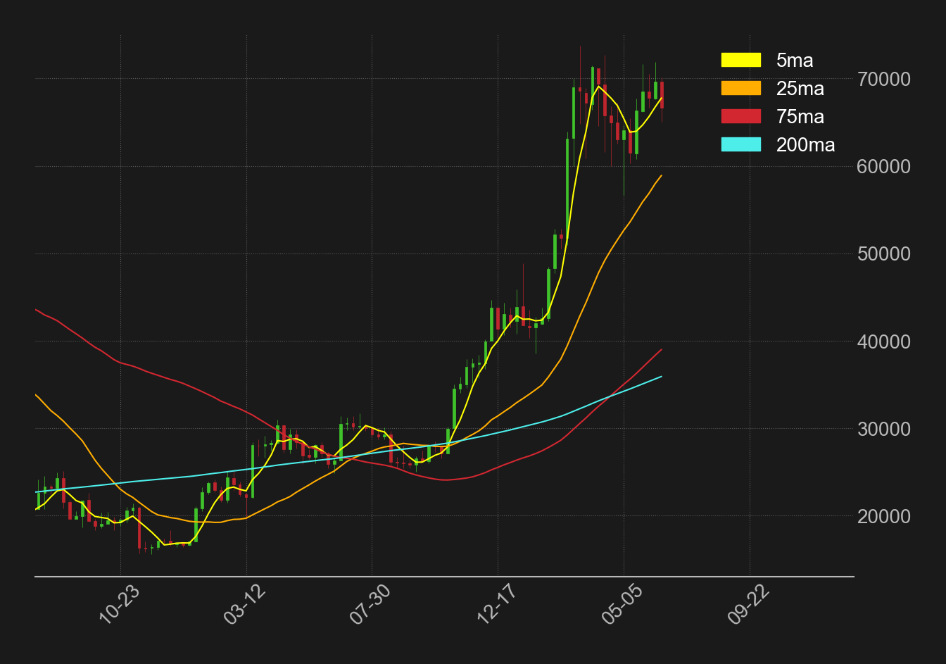 BTCドル週足の移動平均線は、引き続き強気のパーフェクトオーダーを維持しており、相場の地合いが極めて強いことが示唆されている。