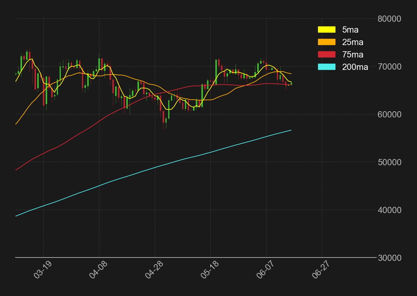 現状では、相場は5日線(66,762ドル)のレジスタンスと75日線(66,154ドル)のサポートに挟まれ、極めて狭いレンジでの推移となっており、75日線を下抜けると目星いサポートがない状況だ。
