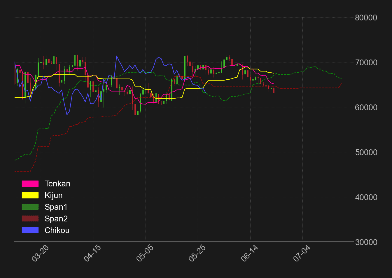 一目均衡表では、①遅行スパンが相場実体を下抜け、②転換線が基準線を下抜け、③相場も雲を割り込んでおり、強い売りシグナルとされる三役逆転が完成している。