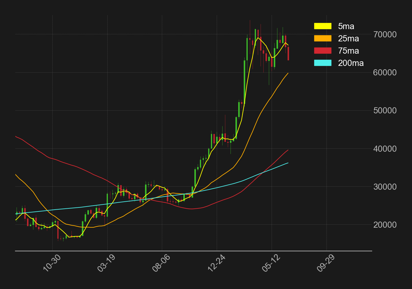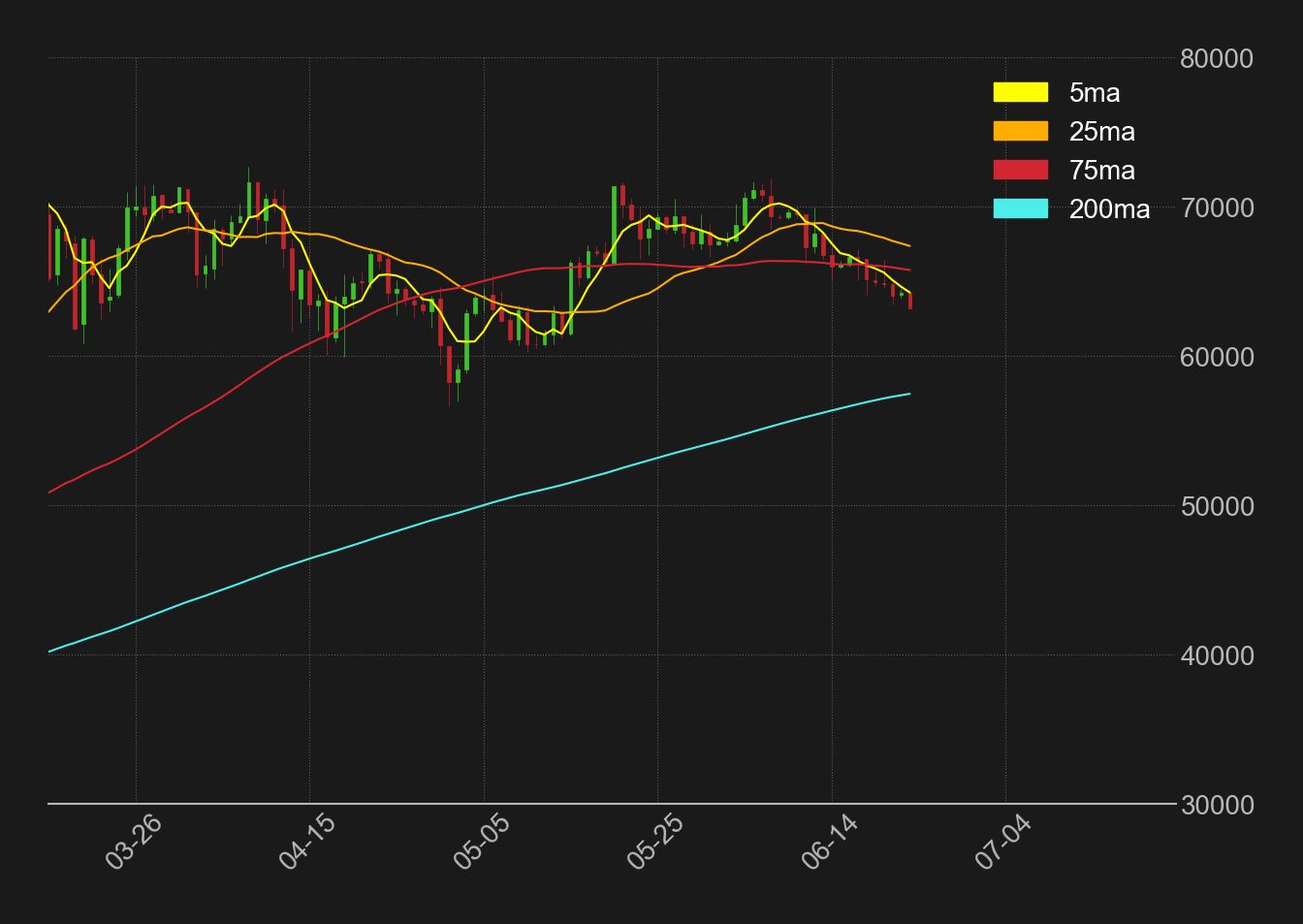 ただ、その他の移動平均線は上向いており、25週線の走る60,000ドル周辺は相場のサポートとして意識される。