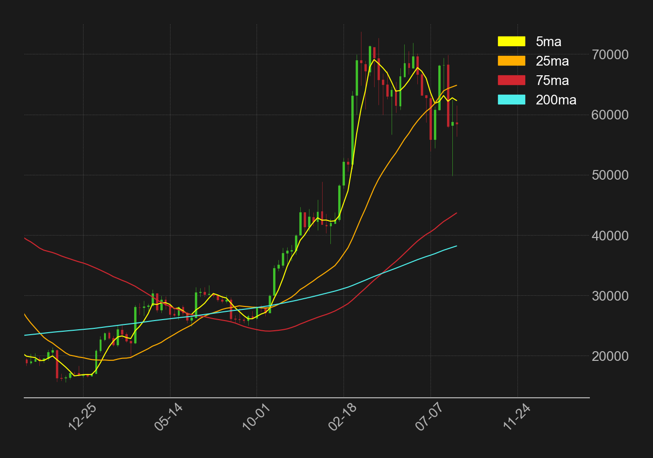 BTCドル週足の移動平均線は、中・長期の移動平均線は上向きの推移を維持しているものの、短期25週線が25週線でデッドクロスを示現している。