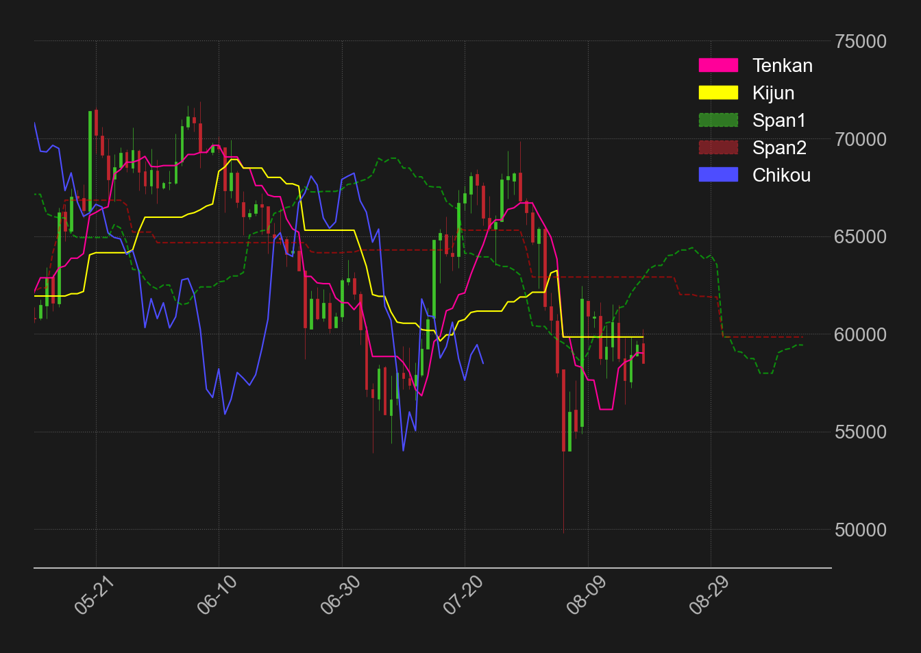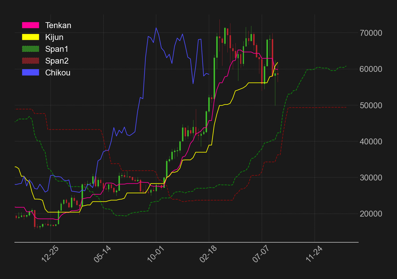 向こう2週間以内に相場が70,000ドル近辺まで戻せなければ、遅行線が相場実体を下回る見通しとなっている。