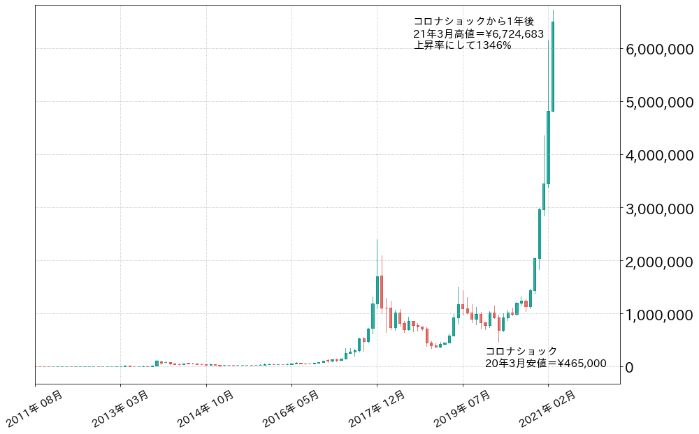 2月は最終週にかけて相場が強く押し、同月高値(615万円)から実に25%の急落劇を繰り広げ、3月は480万円周辺からのスタートとなりましたが、米国での1.9兆ドル規模の追加経済対策の可決、それによる個人現金給付の資金流入期待、米雇用統計の改善や、カナダでのギャラクシーデジタルのビットコイン上場投資信託(ETF)取引開始など、月初から好材料に支えられ、月前半に相場は2月高値を更新し、14日に672.4万円の史上最高値を付けました。