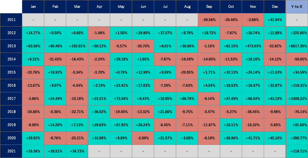 3月のビットコイン対円相場は1,674,382円(34.73%)高の6,495,623円と、月足の上昇幅としては過去最大となり、6ヶ月続伸しました(第1図)。3月はビットコインにとって価格の下がりやすい月となっており、2012年から2020年まで3勝6敗という成績でしたが、今年の3月はこうした「弱気アノマリー」を覆す結果となり、年初からは118.71%の上昇率を記録しています(第1表)。