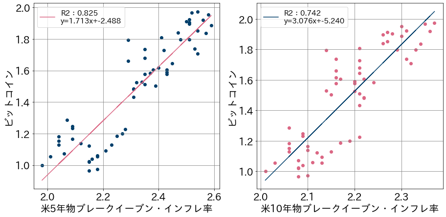 当方では繰り返し、米国の期待インフレ上昇がビットコイン価格を押し上げる一つの要因と指摘してきました。事実、米国債の名目金利と同年限の物価連動債利回りの差であり、市場が予想するインフレ率とされるブレークイーブン・インフレ率(BEI)とビットコインの価格には高い相関関係があり、5年物BEIと10年物BEIとの決定係数(R2)は、それぞれ0.825と0.742となっています(第2図:目盛りを百分率(%)に合わせるために、ビットコインの価格を米10年債利回りが1%を超え、10年物BEIが2%に乗せた1月4日の終値を100として指数化しています)。