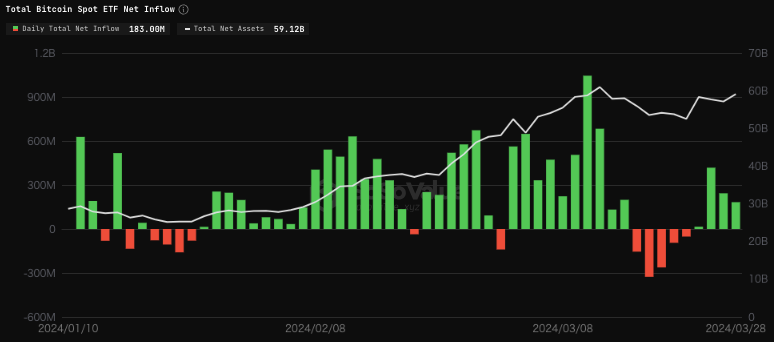 上述の通り、3月のETFへのフローは12日の10.5億ドルをピークに急低下し、18日〜22日にかけてはネットフローが5営業日連続で純流出となり、相場に下押し圧力を掛けた。フローにブレーキが掛かった大きな理由としては、流入トップ2のIBITとFBTCへのフローが急減したことと、GBTCからの資金流出が急増したことと言える。しかし、BTC相場の過熱感が後退し、6万ドル台前半で底打ちとなると、トップ2への資金流入は徐々に回復し、GBTCからの資金流出ペースも落ち着き始め、25日から3月の最終営業日となった29日まで日次フローは資金の純流入を維持した(第3図)。