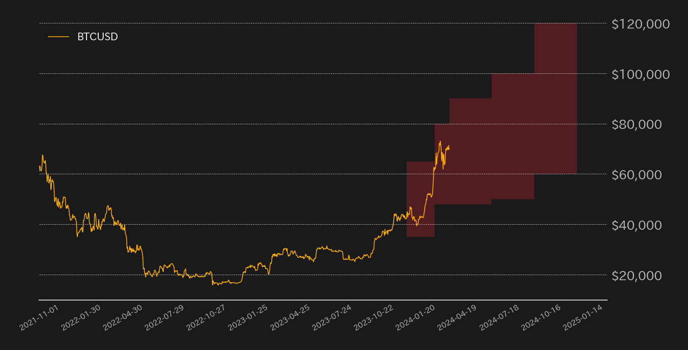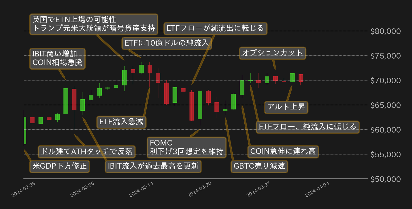 しかし、19日〜20日に米連邦準備理事会(FRB)が開催した連邦公開市場委員会(FOMC)では、政策金利の誘導目標レンジが据え置かれたと一方で、タカ派にシフトすると予想されていた年内の利下げ回数想定が3回に維持されたことで、BTCドルは急反発を演じ65,000ドルを回復。その後は70,000ドルまで戻せず失速するも、グレイスケールのETF(GBTC)からの資金流出ペースがピークアウトしたことや、コインベースの株価上昇を好感し、25日には70,000ドルにタッチした。