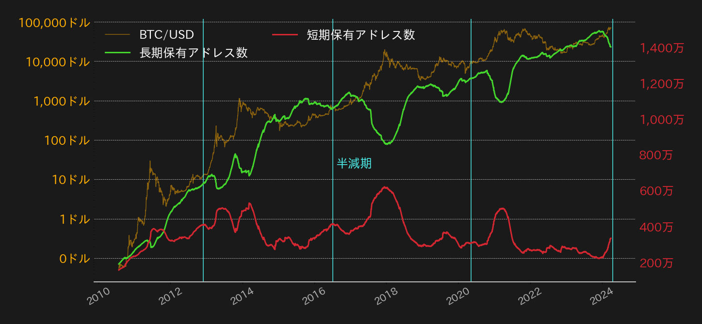 また、半減期を迎える前にBTC相場が急速に上昇したことで、市場では相場トレンドの持続性に懸念を示す声も散見されるが、これまでのディストリビューション局面ではSTHアドレス数が500万〜600万件まで上昇してきたことを考慮すると、需要サイドの余力は残されていると指摘される。