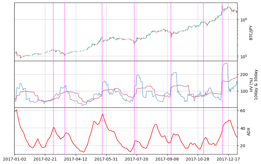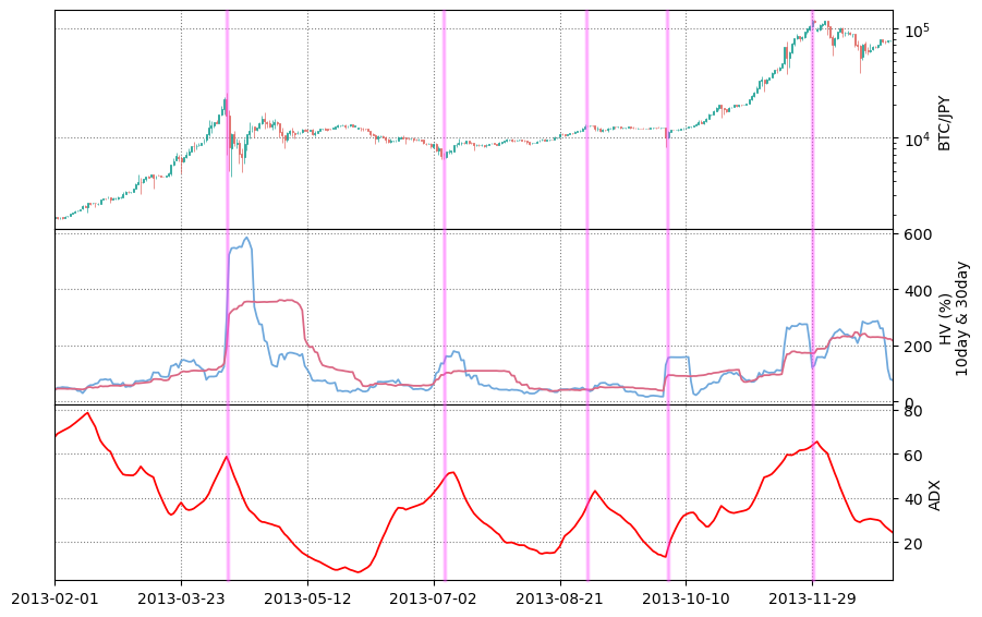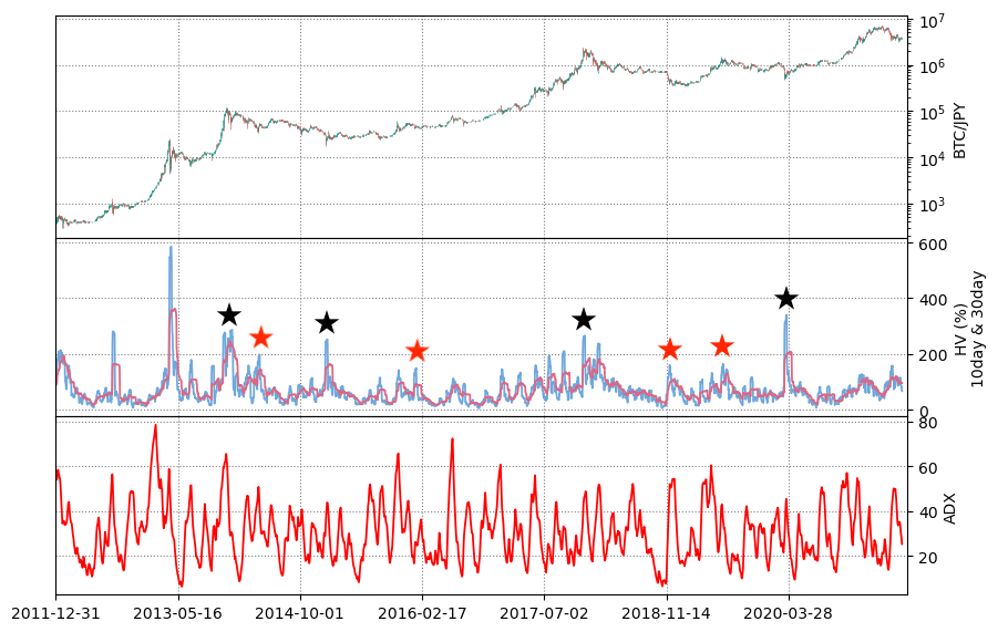 第2図は、2012年〜のビットコイン対円相場(上段)にHV(中段)とADX(下段)を表示させたチャートになります。
