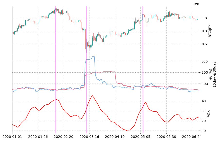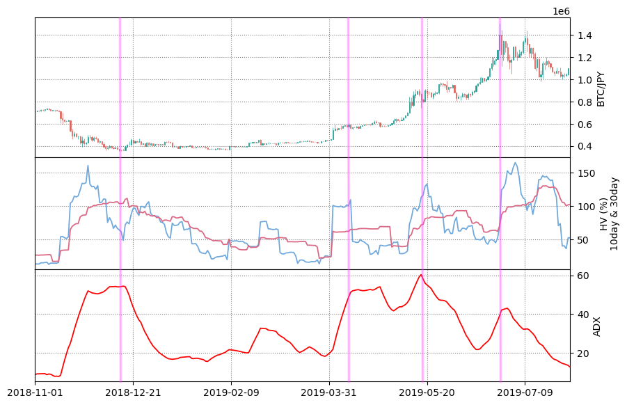 結論、ビットコイン価格の値動きが激しくなりHVやADXが上昇すると、相場の長期トレンドが折り返す傾向があり、普段から変動率の激しい仮想通貨のビットコインでも「波高きは天底の兆し」が通用すると言えます。HVは、短期10日物が200%を明確に超えると相場の天底となってきており、ADXは40を超えるとトレンドの終盤が警戒されるレベルと言えます。