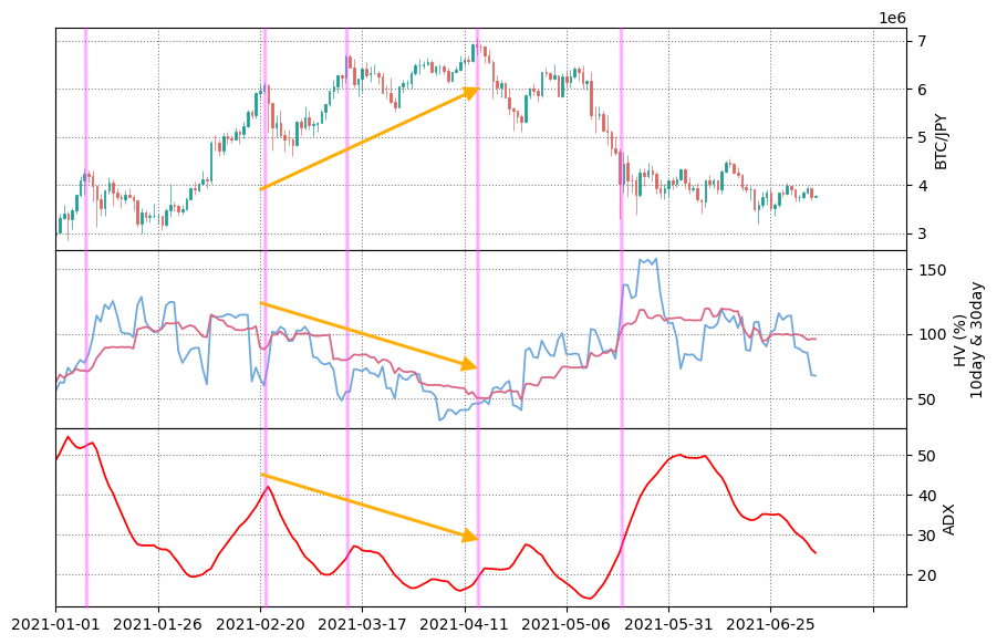 ここでは、価格は4月まで高値と安値を切り上げて上昇トレンドを形成していましたが、HVとADXは下降トレンドとなっており、値動きの激しさが後退していっていることがわかります。こうした価格とモメンタム指標が逆の動きをすることを「ダイバージェンス」と言いますが、実はこれ自体がトレンドの反転シグナルとされており、2021年のビットコインは波は高くないものの天井を形成した格好です。