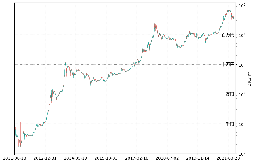 第3〜7図はビットコイン対円相場の長期トレンドの節目をピックアップしたチャートになります。各図内のピンクの縦線は、目算ですが、相場の折り返し地点を示しています。