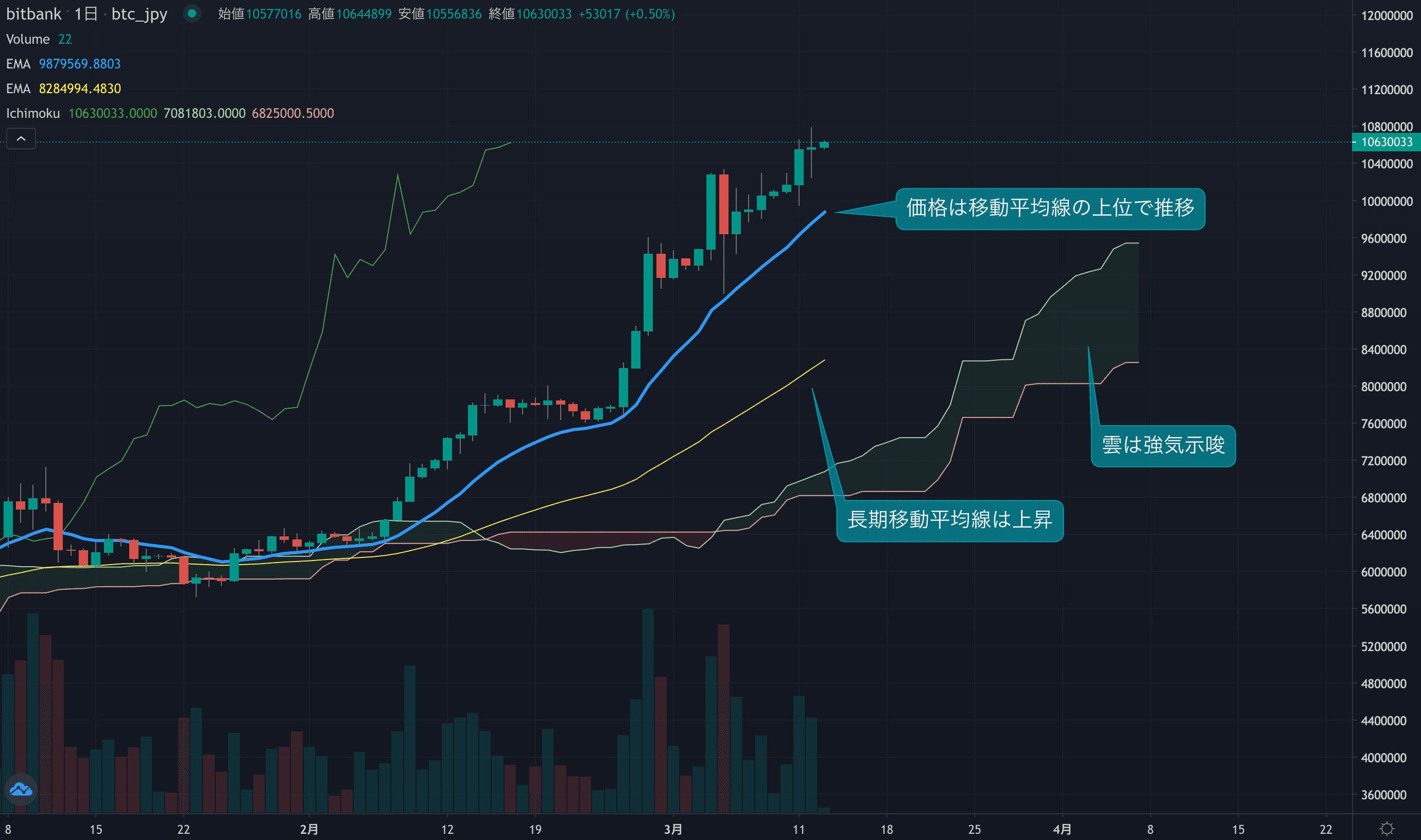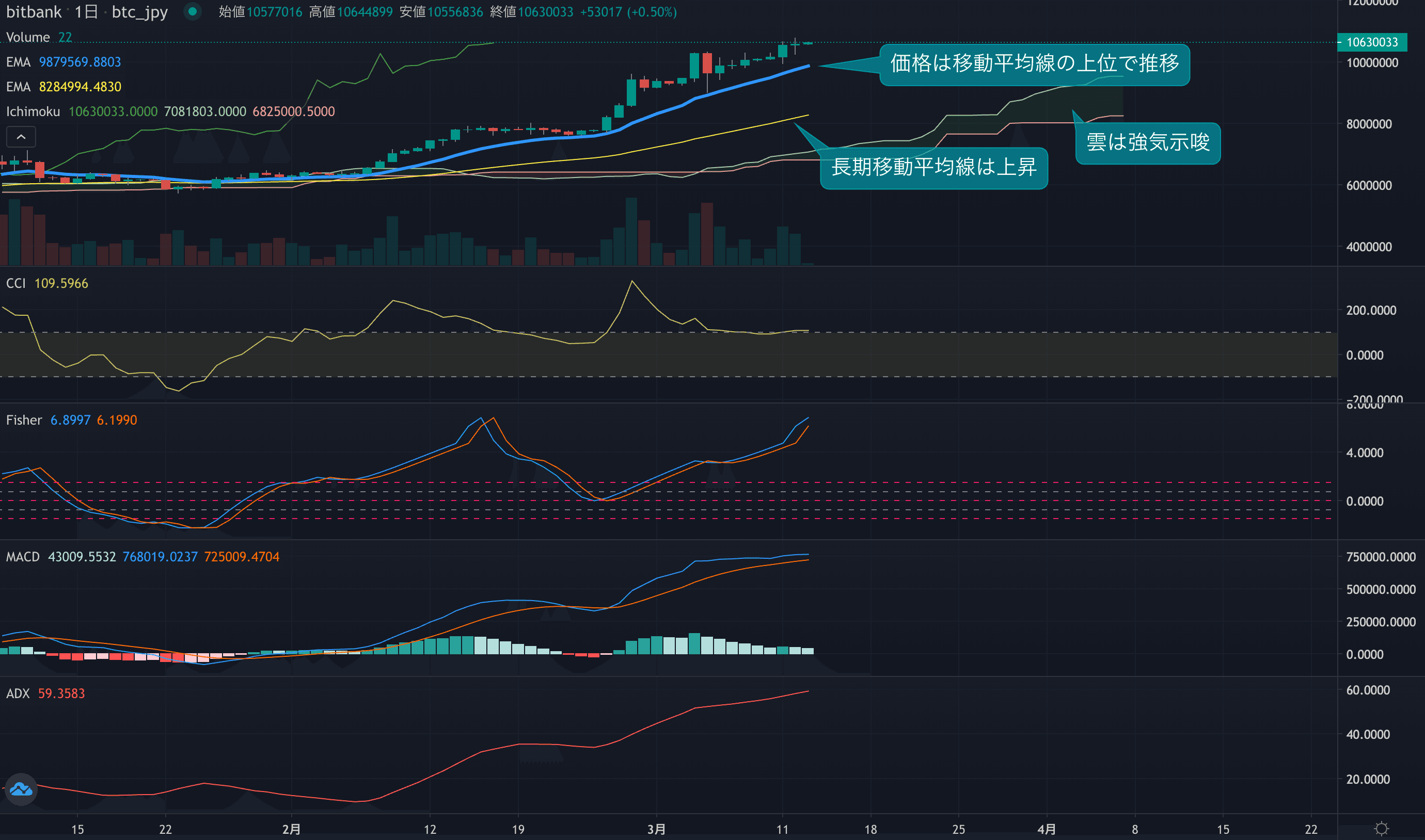 日足は7日連続陽線を記録、昨日は高値も更新し1070万円台へ