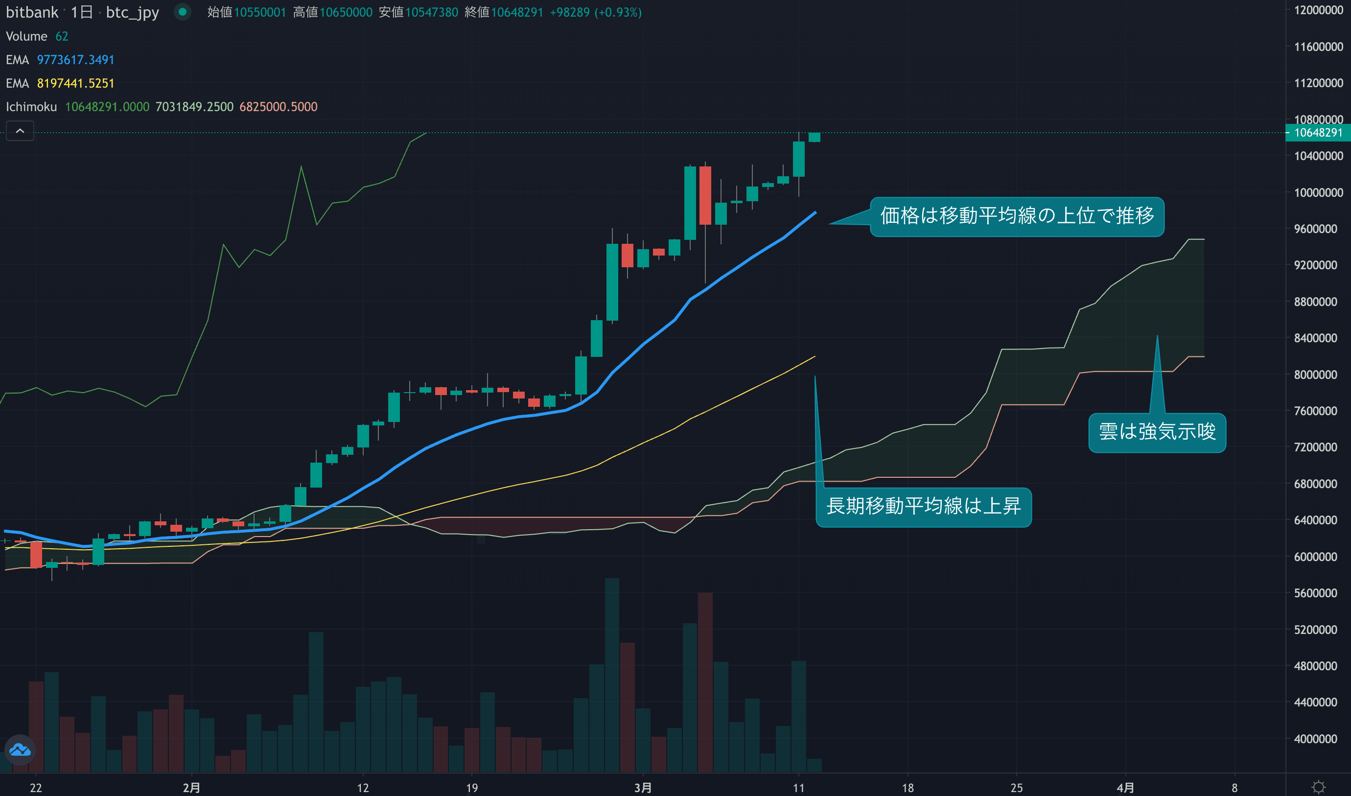 - 価格は14EMA(963.9万円)を上回り強気示唆です。53EMA(810.3万円)は上昇しており、長期トレンドも強気です。一目均衡表の雲は先行スパン1(948.2万円)が先行スパン2(819.4万円)を上回り強気示唆です。