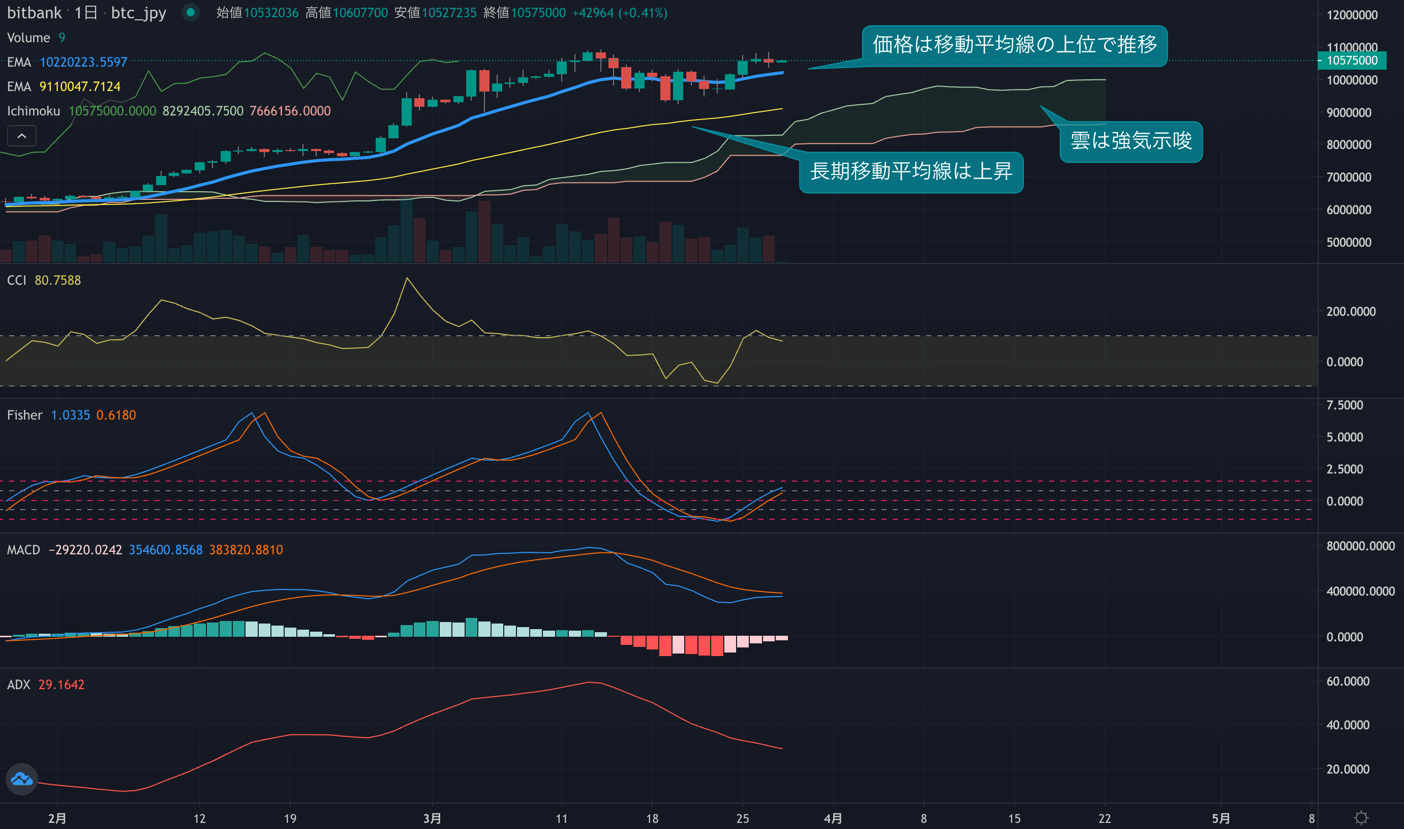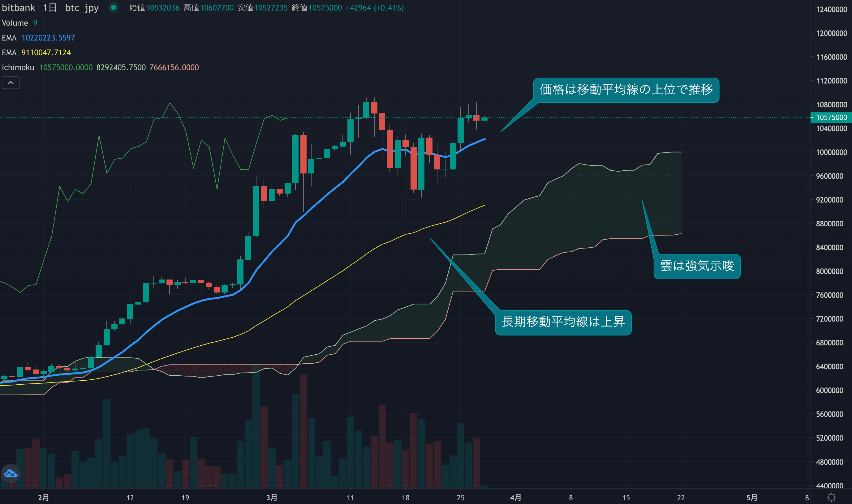 - 価格は14EMA(1016.5万円)を上回り強気示唆です。53EMA(905.3万円)は上昇しており、長期トレンドも強気です。一目均衡表の雲は先行スパン1(1000.0万円)が先行スパン2(860.7万円)を上回り強気示唆です。