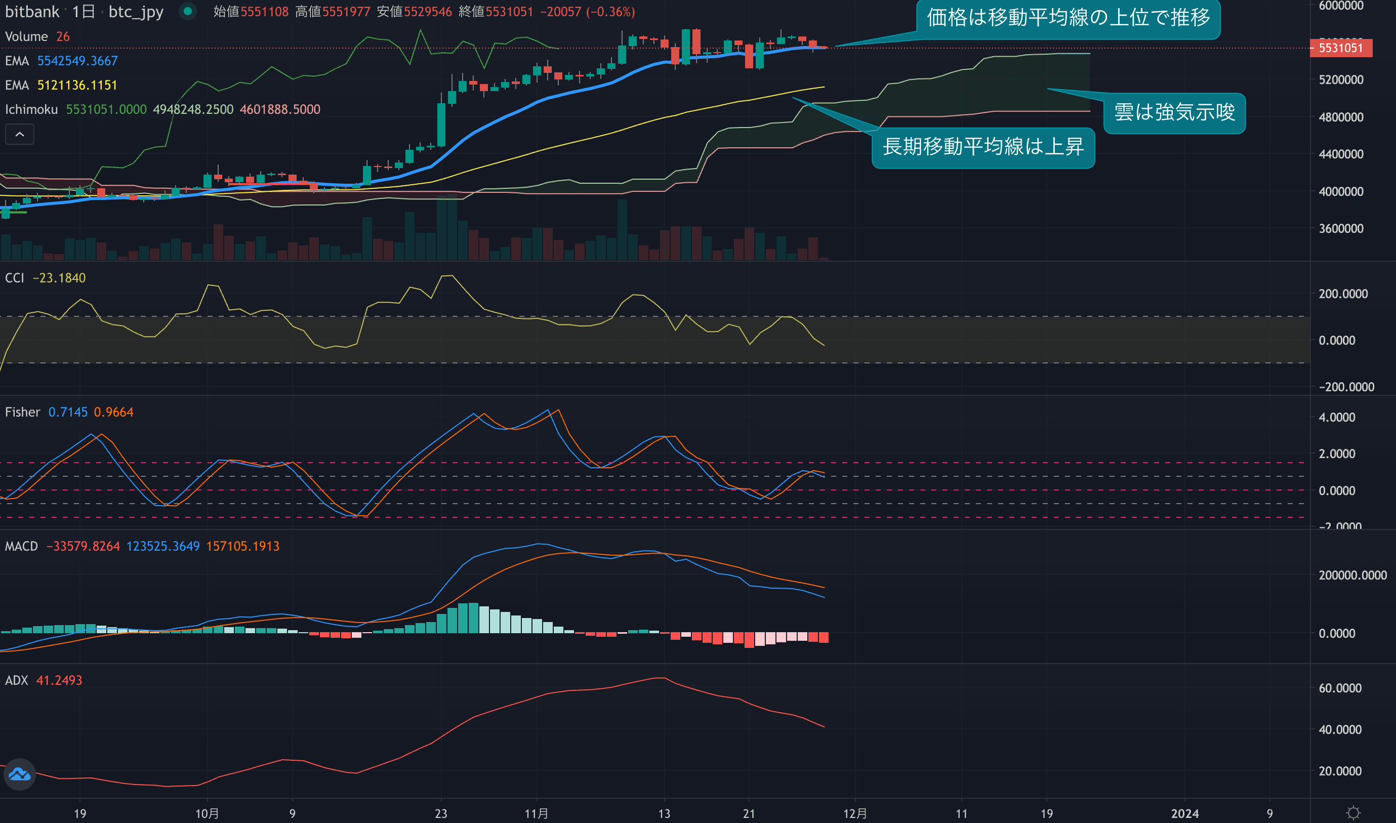 - 昨日のビットコインは1.0%下落し、終値は555.1万円でした。週明けとなった昨日は、日曜日からの下落の流れが継続し、2日連続の陰線を記録しました。一方、価格は移動平均線の上位を維持し、ここ3週間近く価格は高値圏でレンジでの推移となっています。