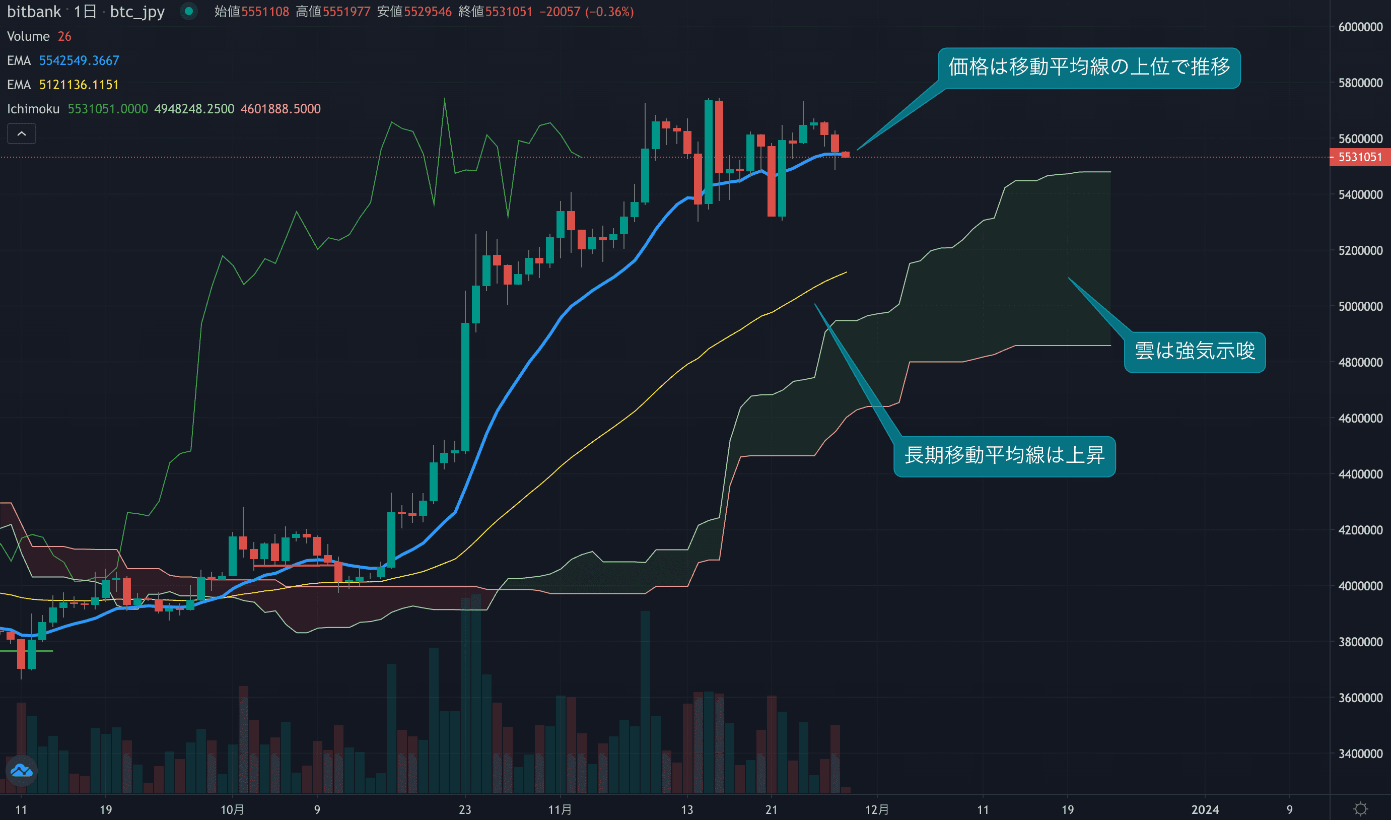 - 価格は14EMA(554.4万円)を上回り強気示唆です。53EMA(510.5万円)は上昇しており、長期トレンドも強気です。一目均衡表の雲は先行スパン1(548.0万円)が先行スパン2(485.9万円)を上回り強気示唆です。