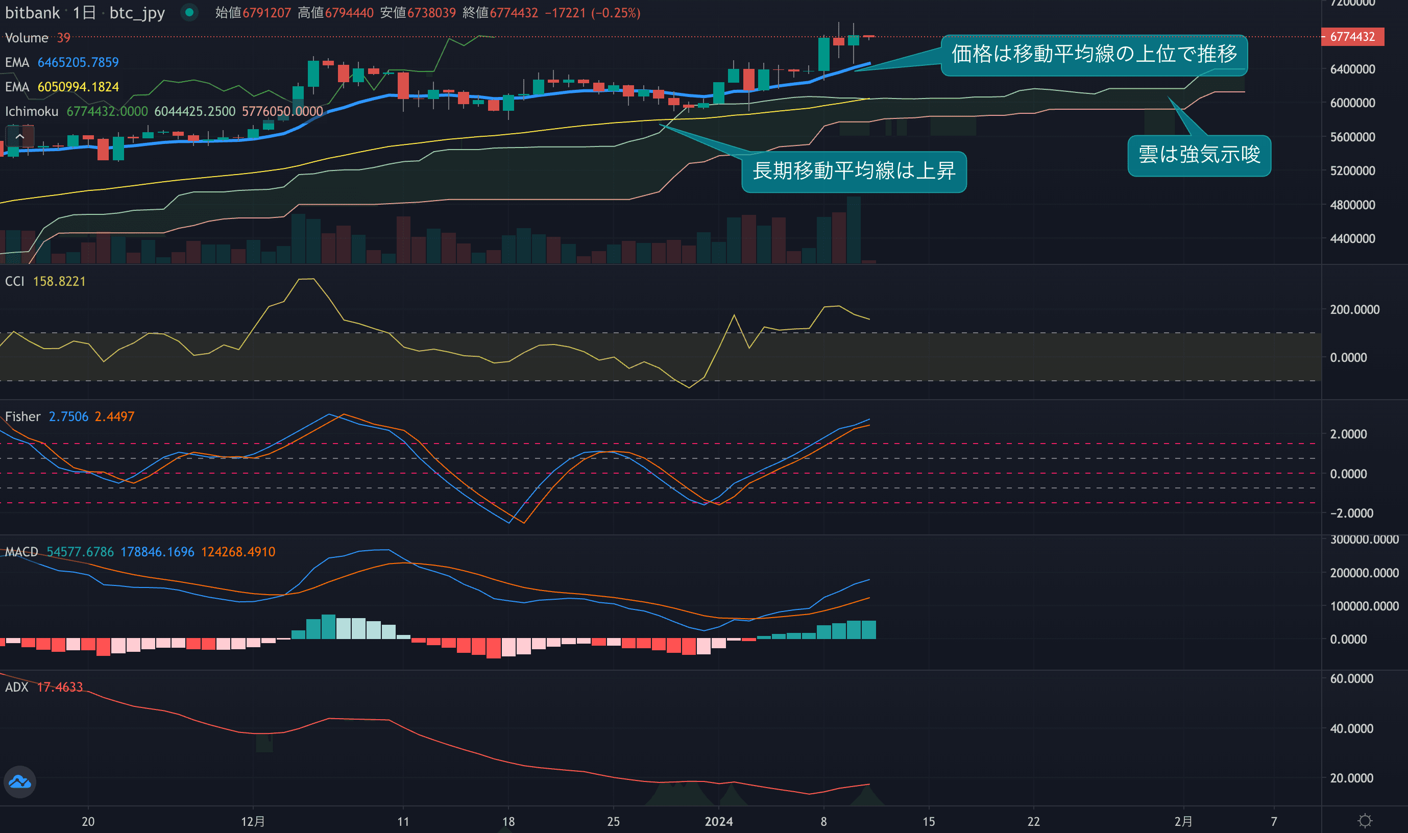 - 昨日のビットコインは一時移動平均線近辺まで下落し、650万円を割り込みましたが、これまでの流れ同様に強い押し目は反発する展開となりました。アメリカでは遂に現物ETFの承認が確定しました。現在のところ短期的な値動きには大きな影響はなく、チャートは強気な状態を維持しています。対円では一時690万円まで上昇しており、700万円台が見えてきました。これまではETF承認の可否動向が注目されていましたが、承認というポジティブな結果となり、今後も相場は底堅い動きが予想されます。週後半も短期トレードは押し目で買いでチャンスを拾いを拾いましょう。