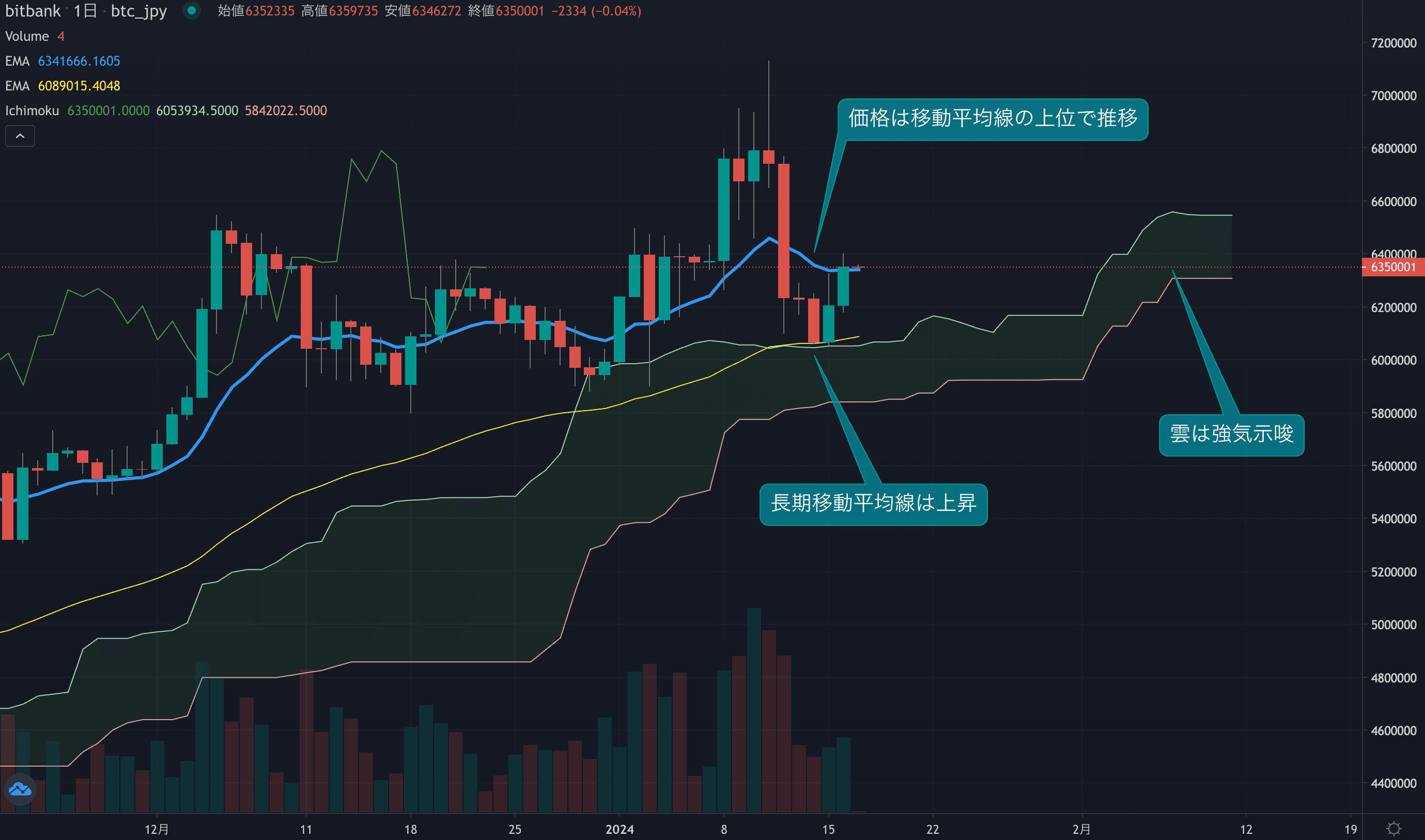 - 価格は14EMA(634.0万円)を上回り強気示唆です。53EMA(607.8万円)は上昇しており、長期トレンドは強気です。一目均衡表の雲は先行スパン1(654.7万円)が先行スパン2(630.9万円)を上回り強気示唆です。