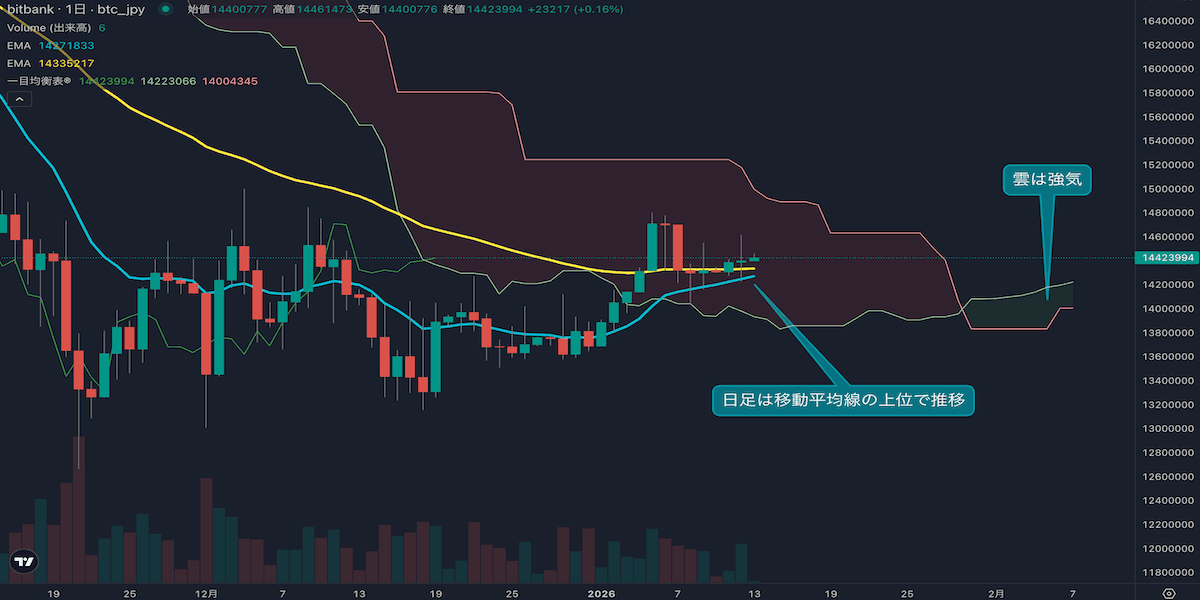 - 価格は14EMA(1424万円)を上回り強気示唆です。53EMA(1433万円)は横ばい推移で、長期トレンドは中立です。一目均衡表の雲は先行スパン1(1419万円)が先行スパン2(1400万円)を上回り強気示唆です。