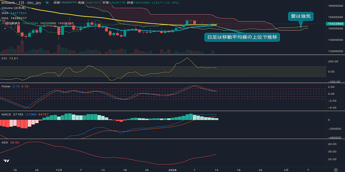 - 昨日のビットコインは0.08%上昇し、終値は1440万円でした。日足は長期移動平均線(53EMA)の上位で推移し、強気の値動きとなっています。