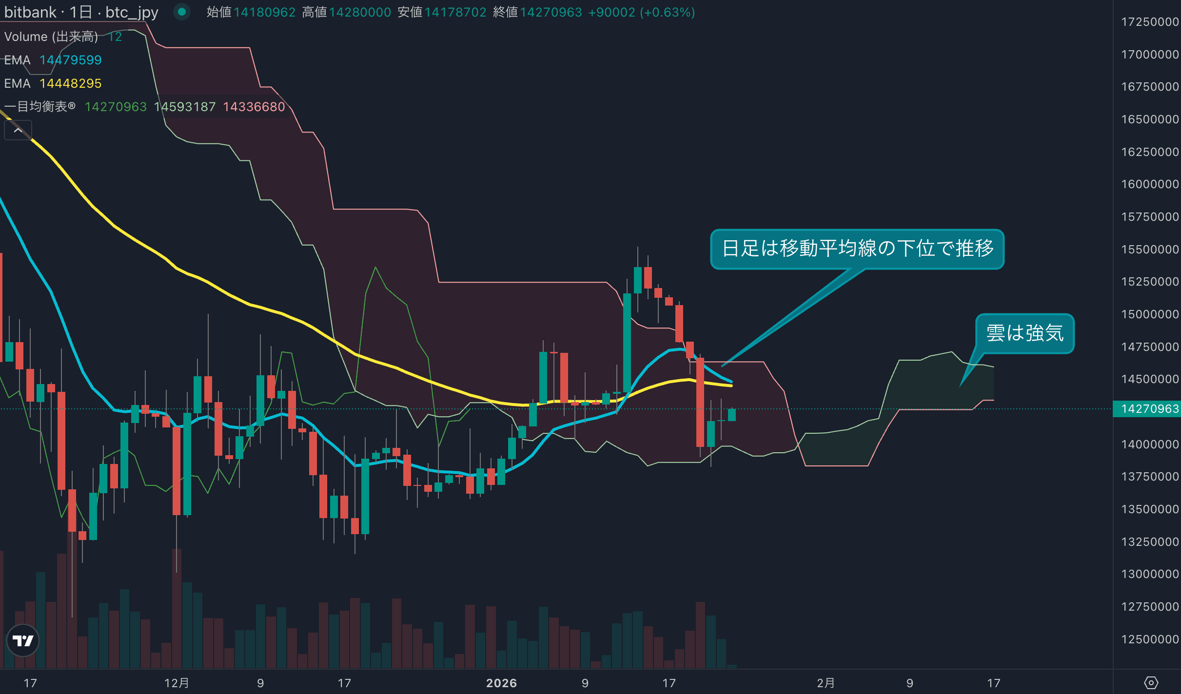 - 価格は14EMA(1451万円)を下回り弱気示唆です。53EMA(1445万円)は下落しており、長期トレンドも弱気示唆です。一目均衡表の雲は先行スパン1(1461万円)が先行スパン2(1433万円)を上回り強気示唆です。