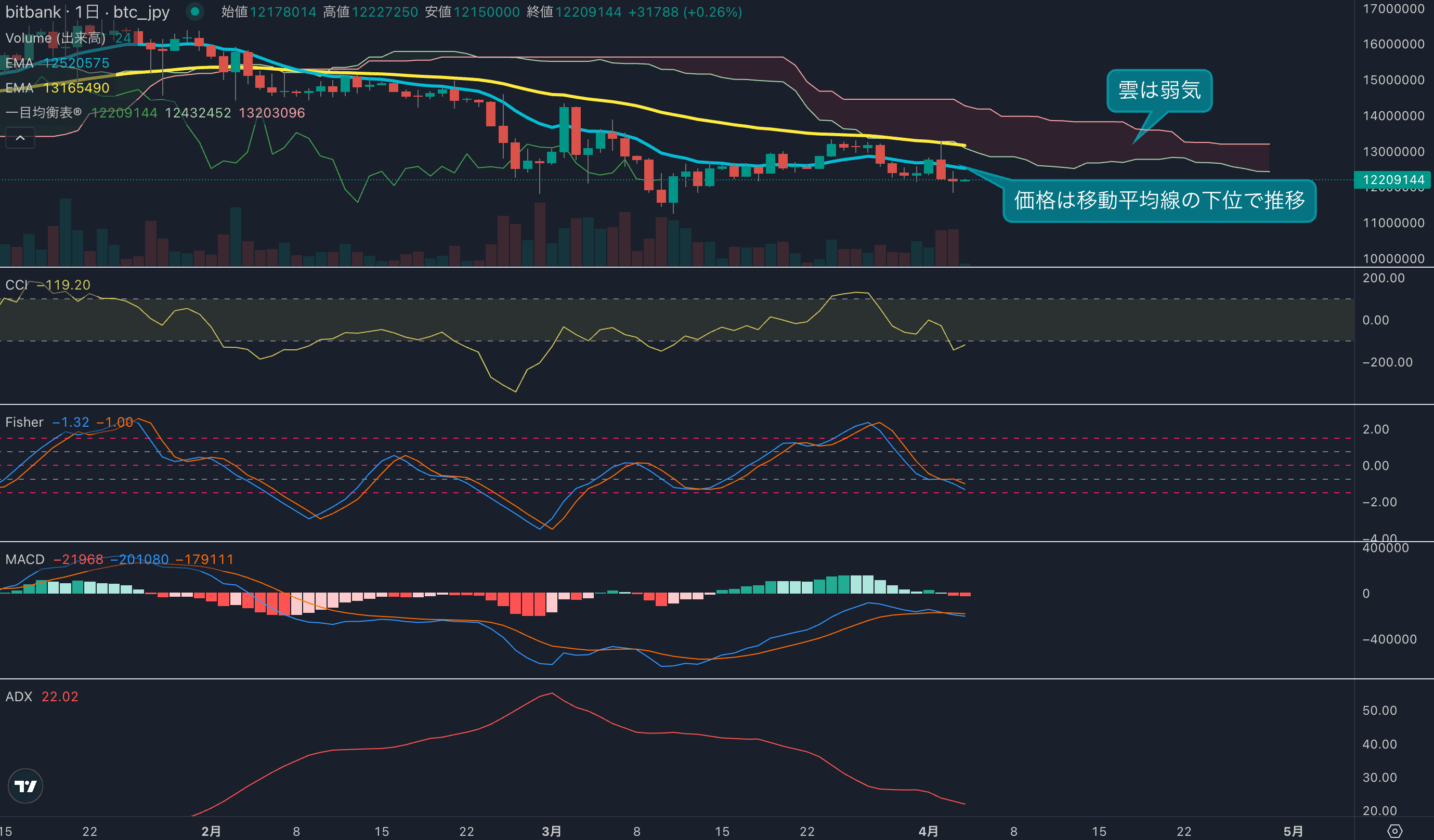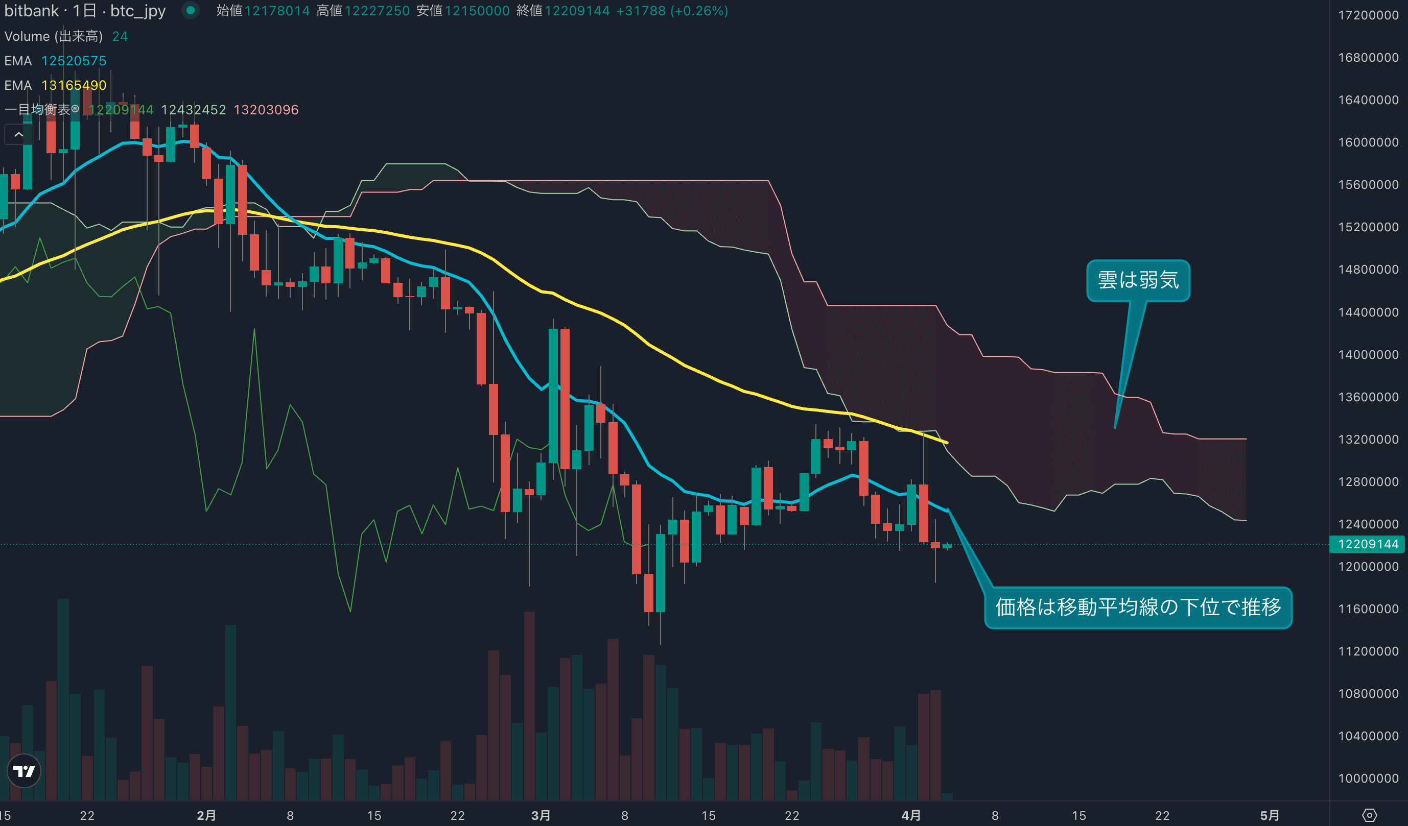 - 価格は14EMA(1256万円)を下回り弱気示唆です。53EMA(1320万円)は下落しており、長期トレンドも弱気です。一目均衡表の雲は先行スパン1(1243万円)が先行スパン2(1320万円)を下回り弱気示唆です。