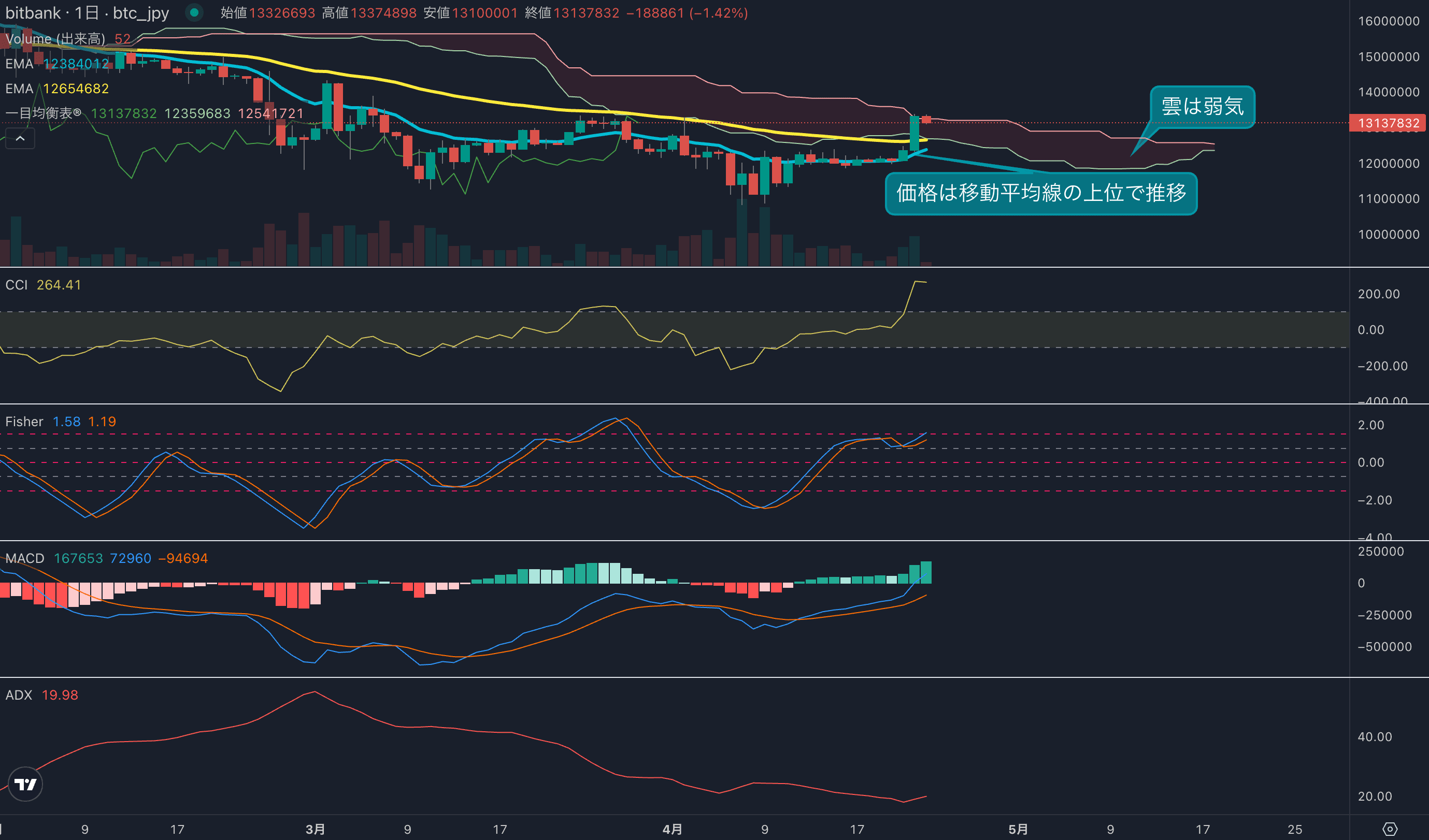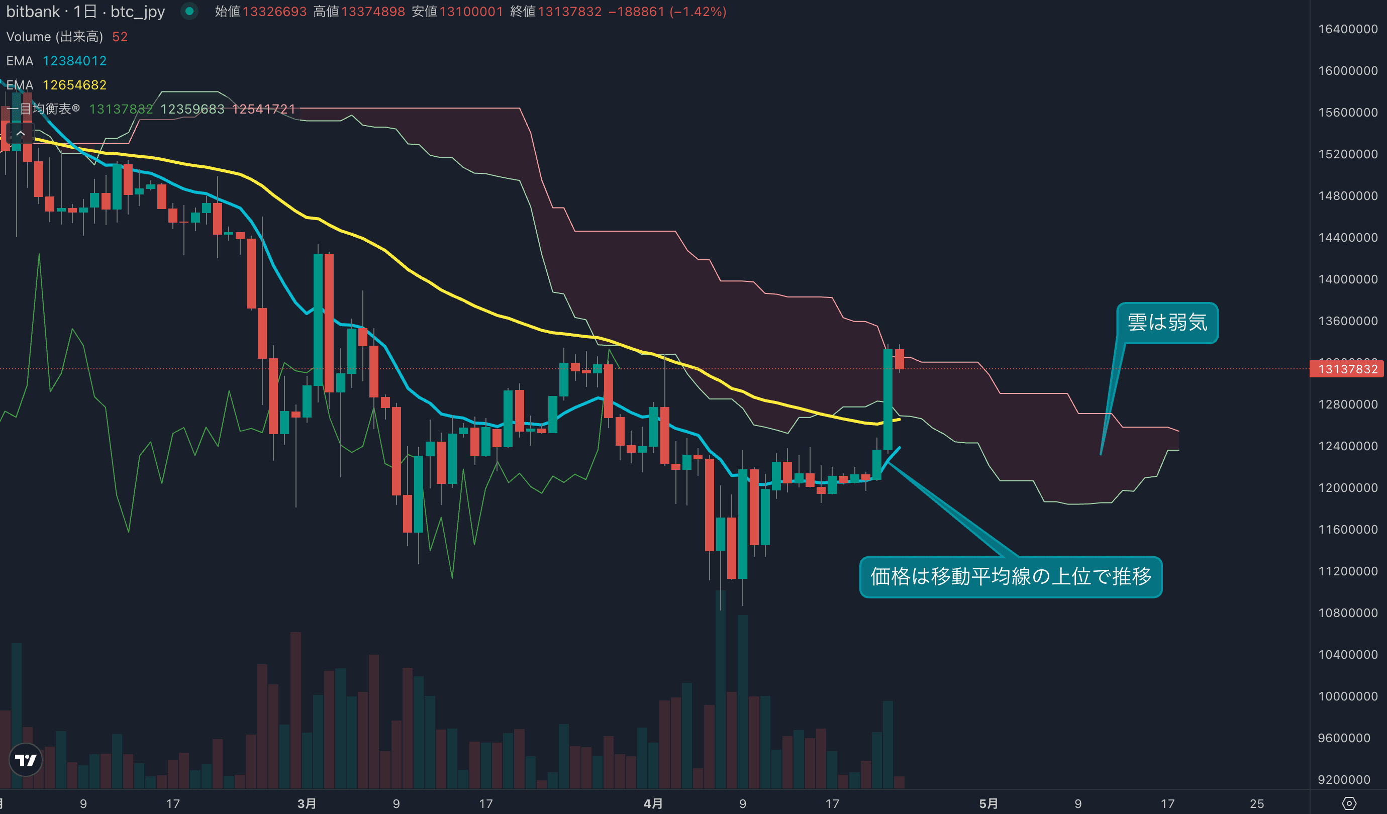 - 昨日のビットコインは7.7%上昇し、終値は1332万円でした。昨日は相場が上に抜ける動きが見られ、強く買われました。日足は約2ヶ月半ぶりに長期移動平均線(53EMA)の上位に浮上しました。