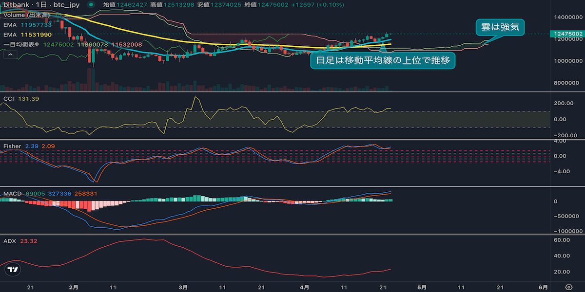 - 昨日のビットコインは2.3%上昇し、終値は1246万円でした。日足は3日連続の陽線となりました。先週の高値を更新し、強い買いが継続しています。