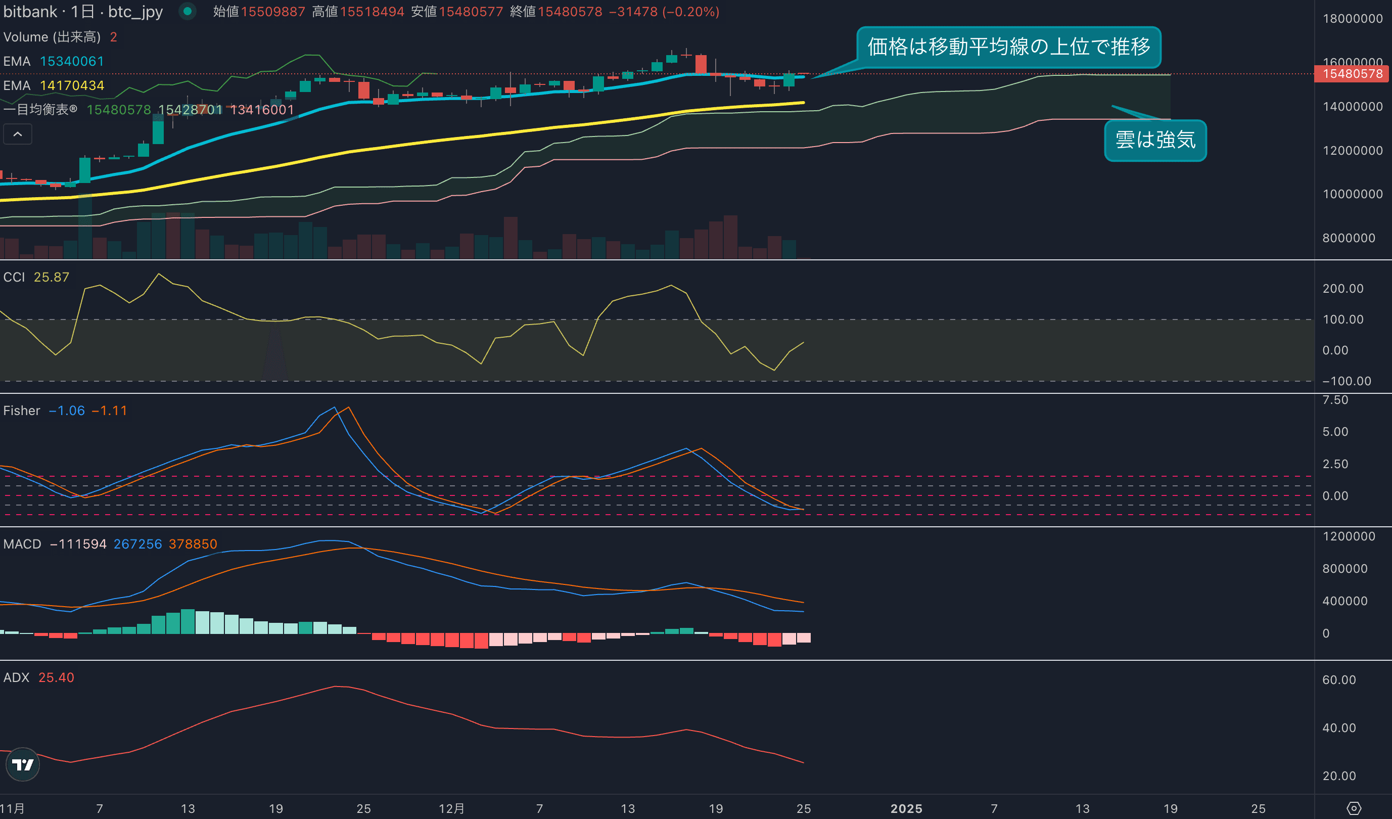 - 価格は14EMA(1531万円)を上回り強気示唆です。53EMA(1412万円)は上昇しており、長期トレンドも強気です。一目均衡表の雲は先行スパン1(1542万円)が先行スパン2(1341万円)を上回り強気示唆です。