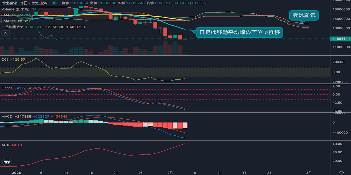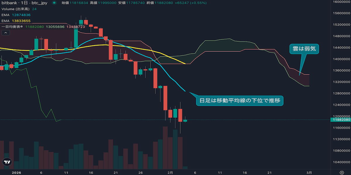 - 価格は14EMA(1302万円)を下回り弱気示唆です。53EMA(1390万円)は下落しており、長期トレンドも弱気示唆です。一目均衡表の雲は先行スパン1(1305万円)が先行スパン2(1345万円)を下回り弱気示唆です。