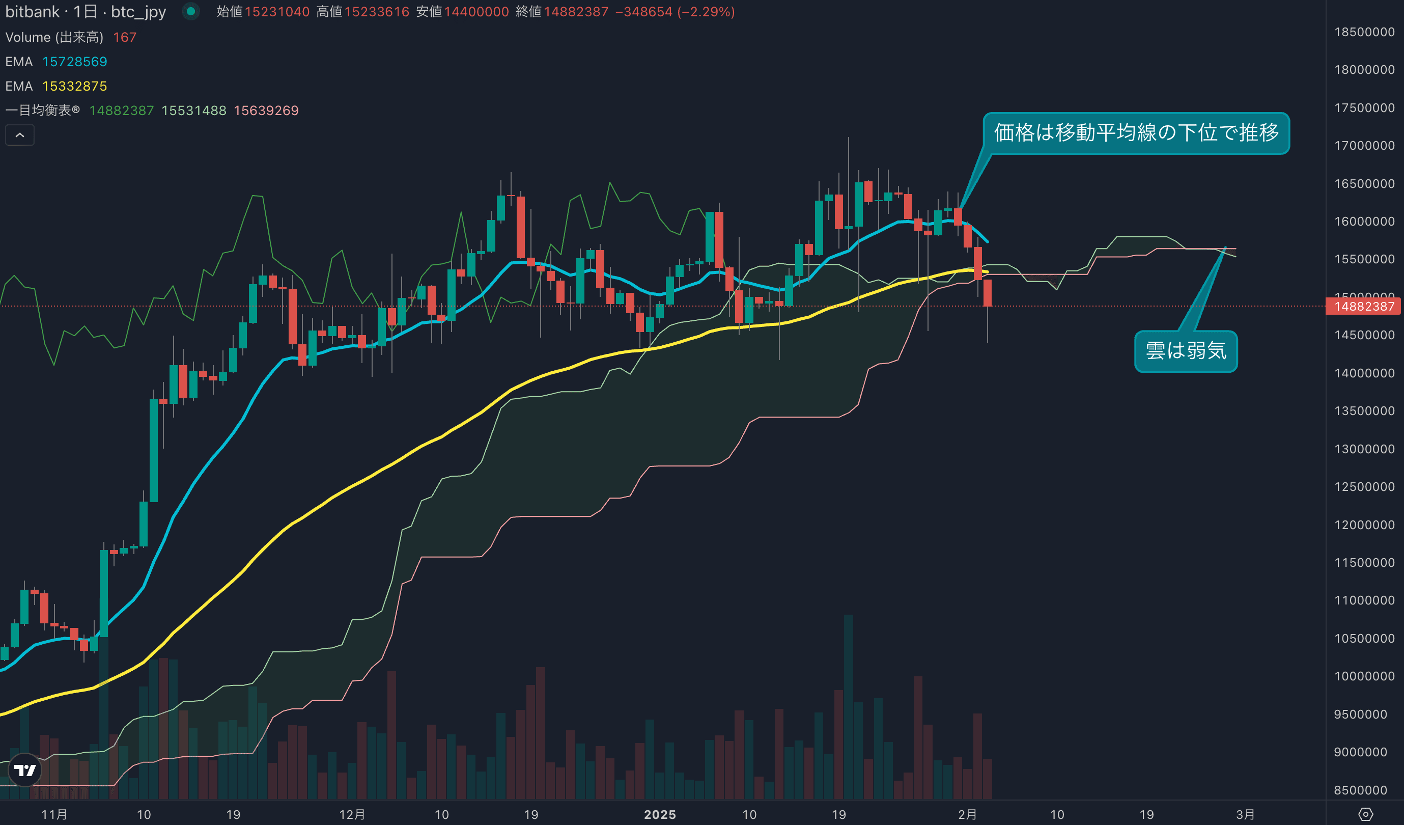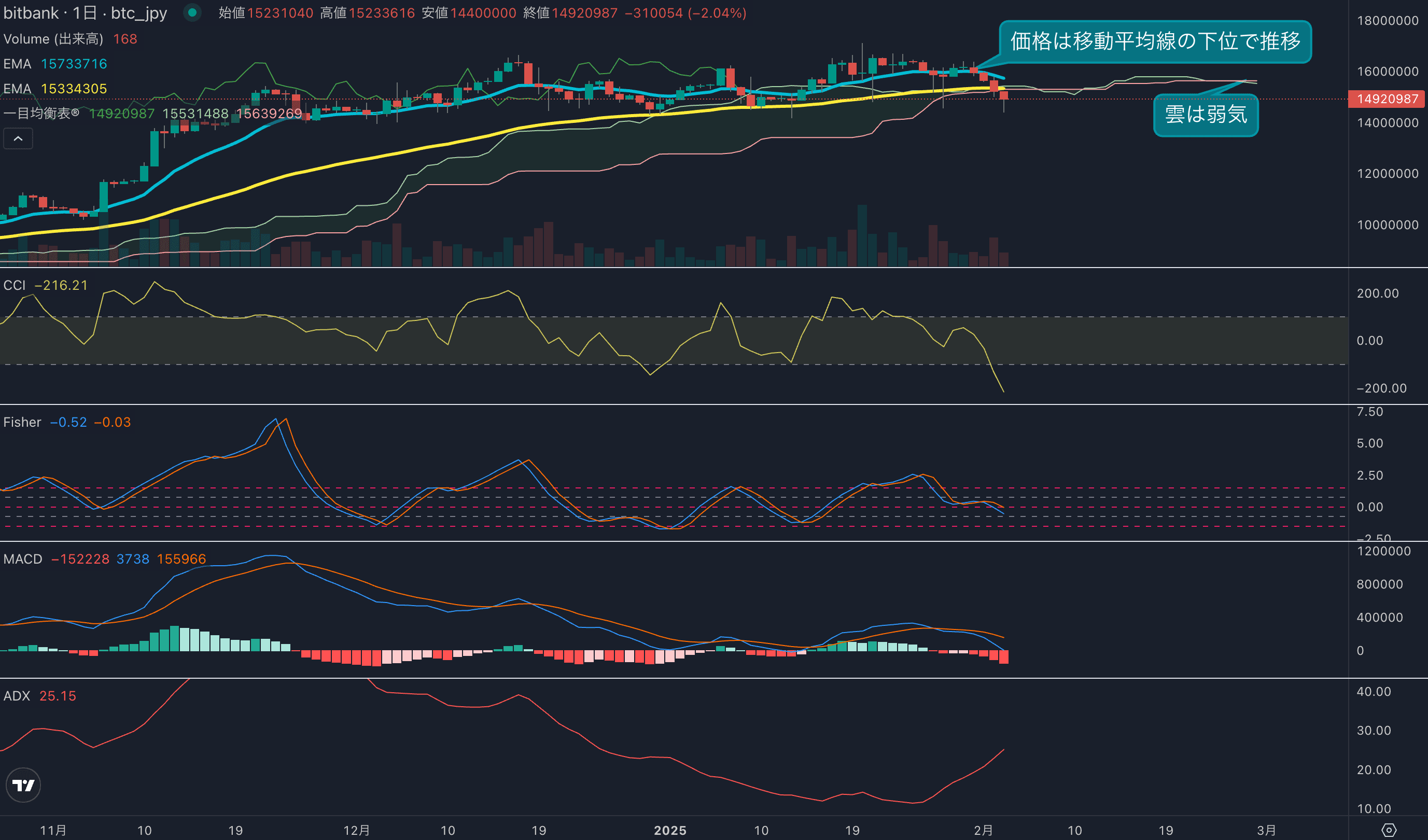 - 価格は14EMA(1585万円)を下回り弱気示唆です。53EMA(1535万円)は下落しており、長期トレンドも弱気です。一目均衡表の雲は先行スパン1(1572万円)が先行スパン2(1533万円)を下回り弱気示唆です。