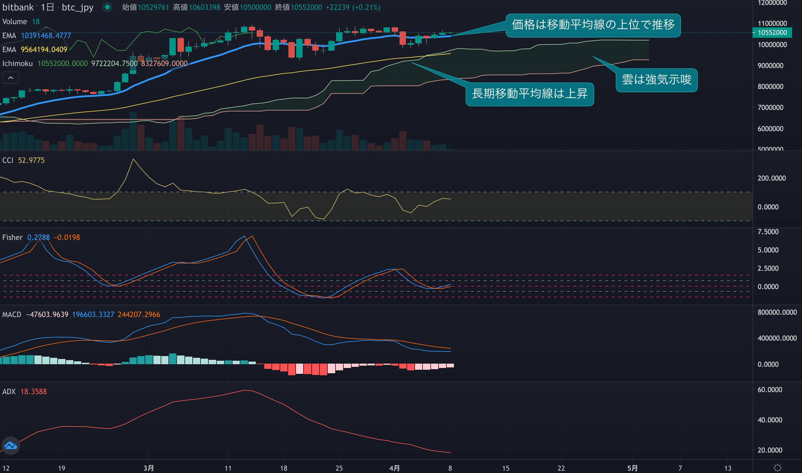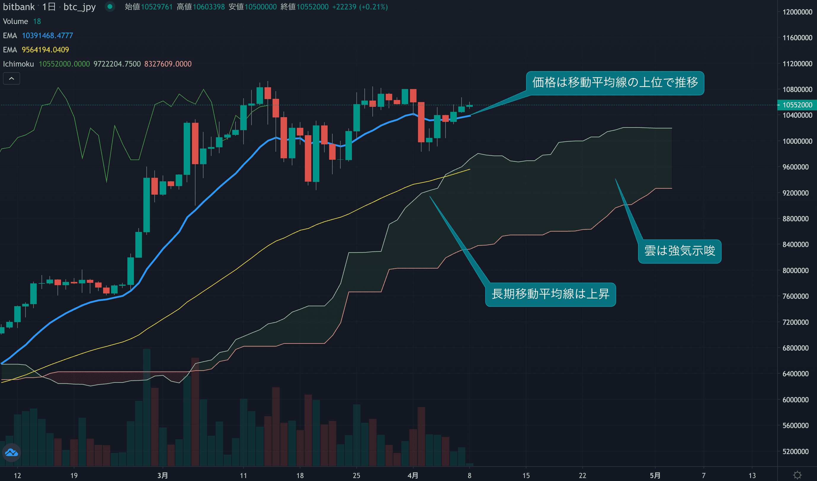 - 価格は14EMA(1036.6万円)を上回り強気示唆です。53EMA(952.6万円)は上昇しており、長期トレンドも強気です。一目均衡表の雲は先行スパン1(1019.9万円)が先行スパン2(926.8万円)を上回り強気示唆です。