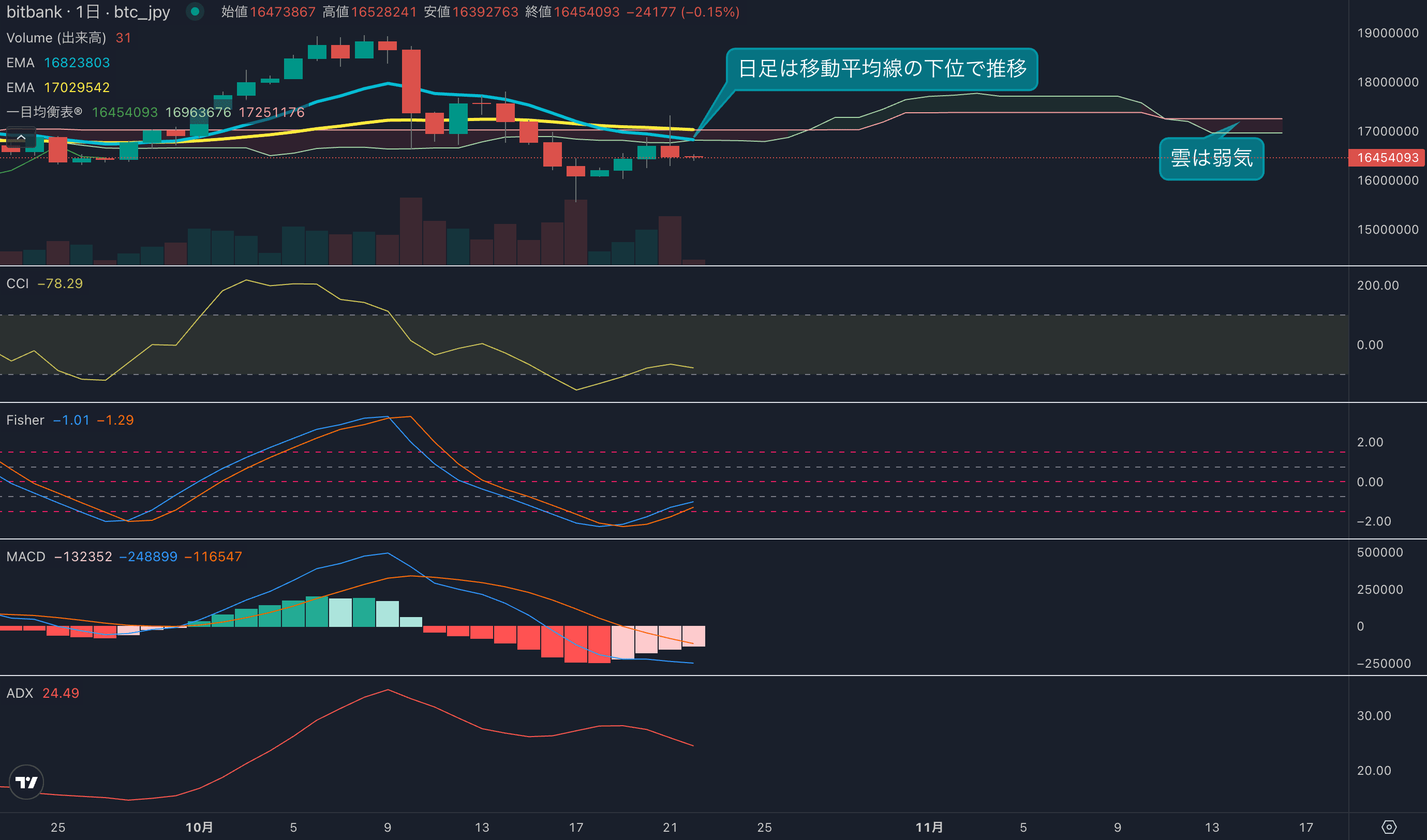 - オシレーター系インジケーターは、短期では反発が見られます。CCIは-65で推移しています。Fisherはマイナス圏で遅行線を上回っています。長期オシレーターのMACDはマイナス圏で下落傾向です。