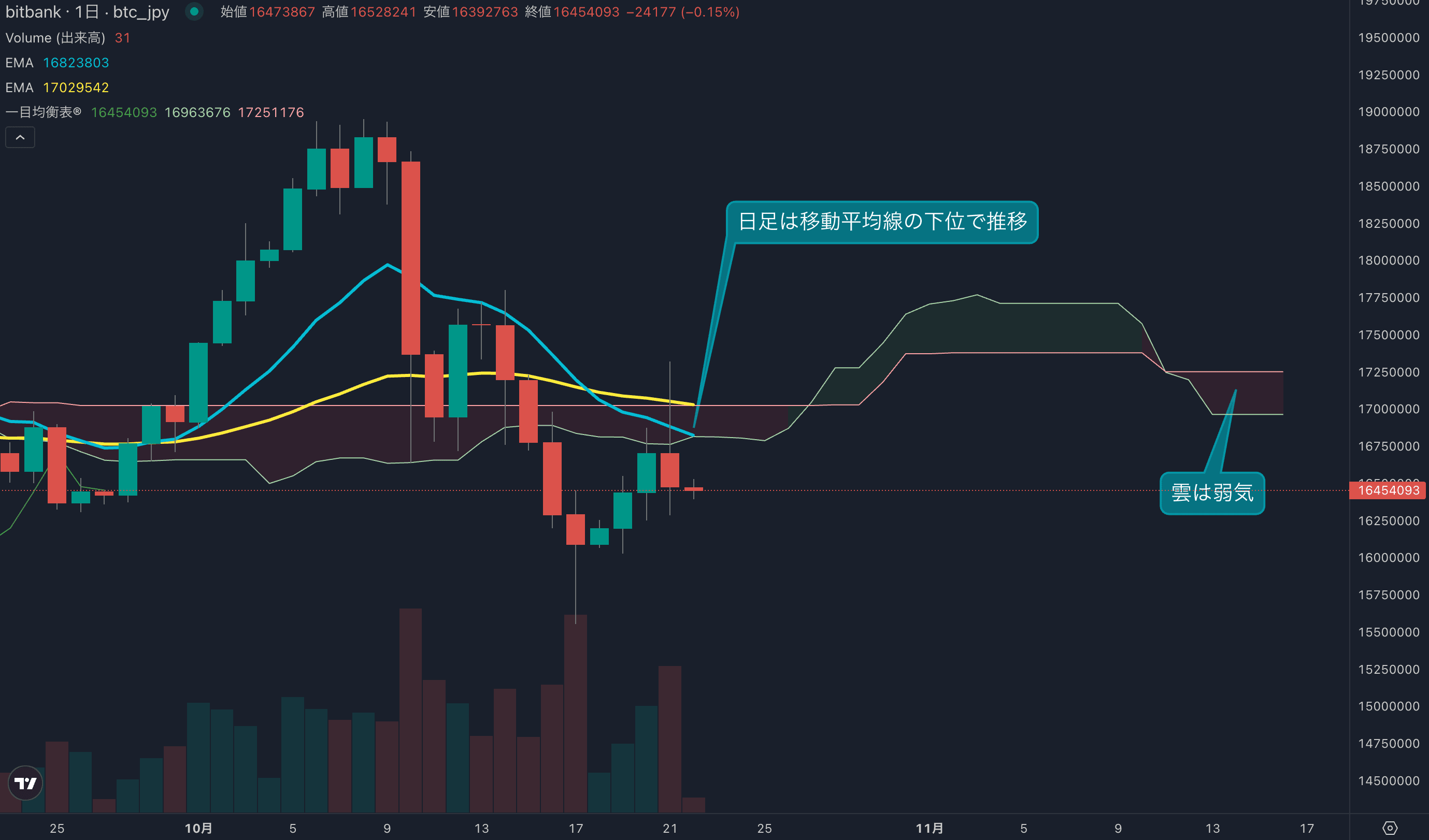 - 価格は14EMA(1688万円)を下回り弱気示唆です。53EMA(1705万円)は下落しており、長期トレンドも弱気です。一目均衡表の雲は先行スパン1(1696万円)が先行スパン2(1725万円)を下回り弱気示唆です。