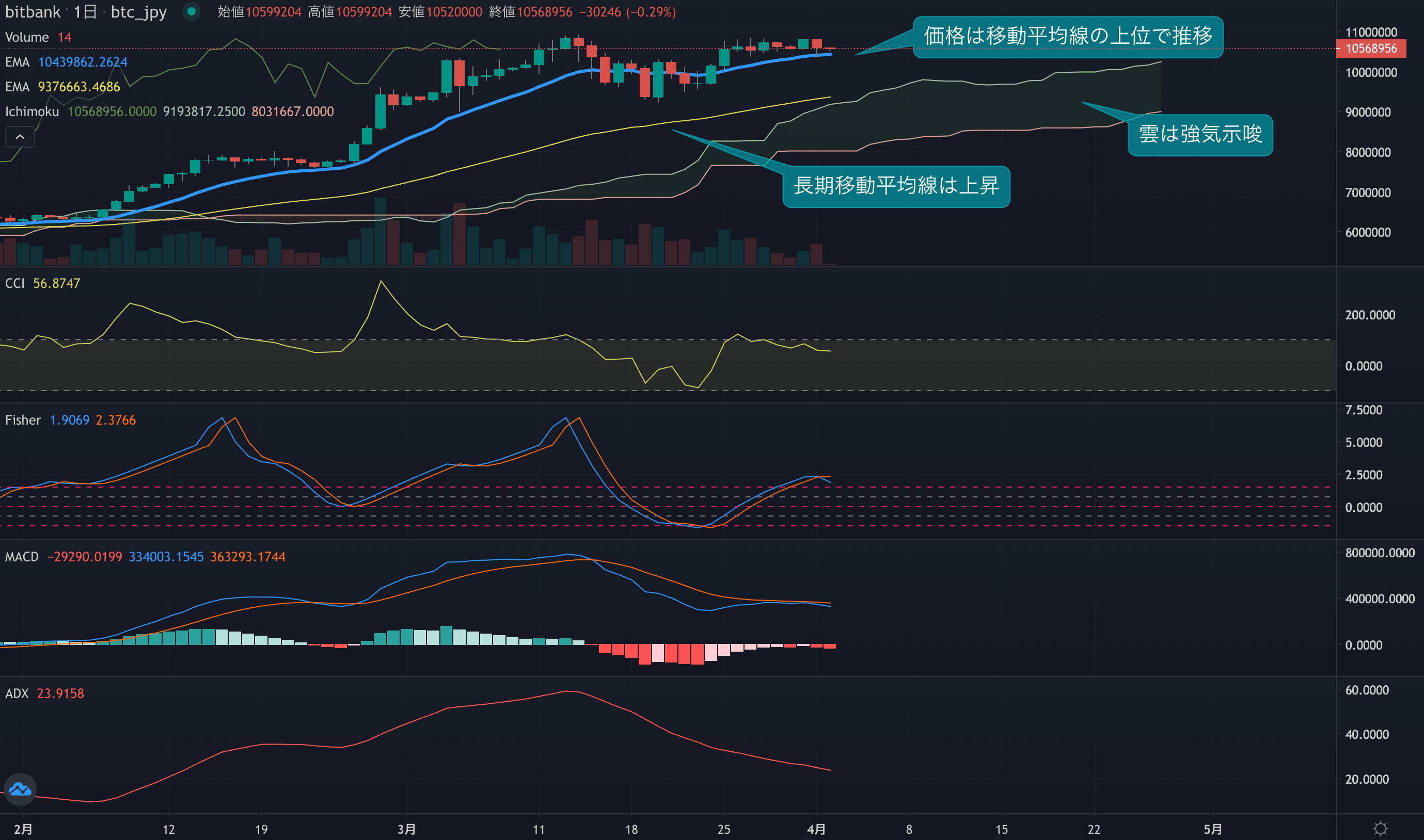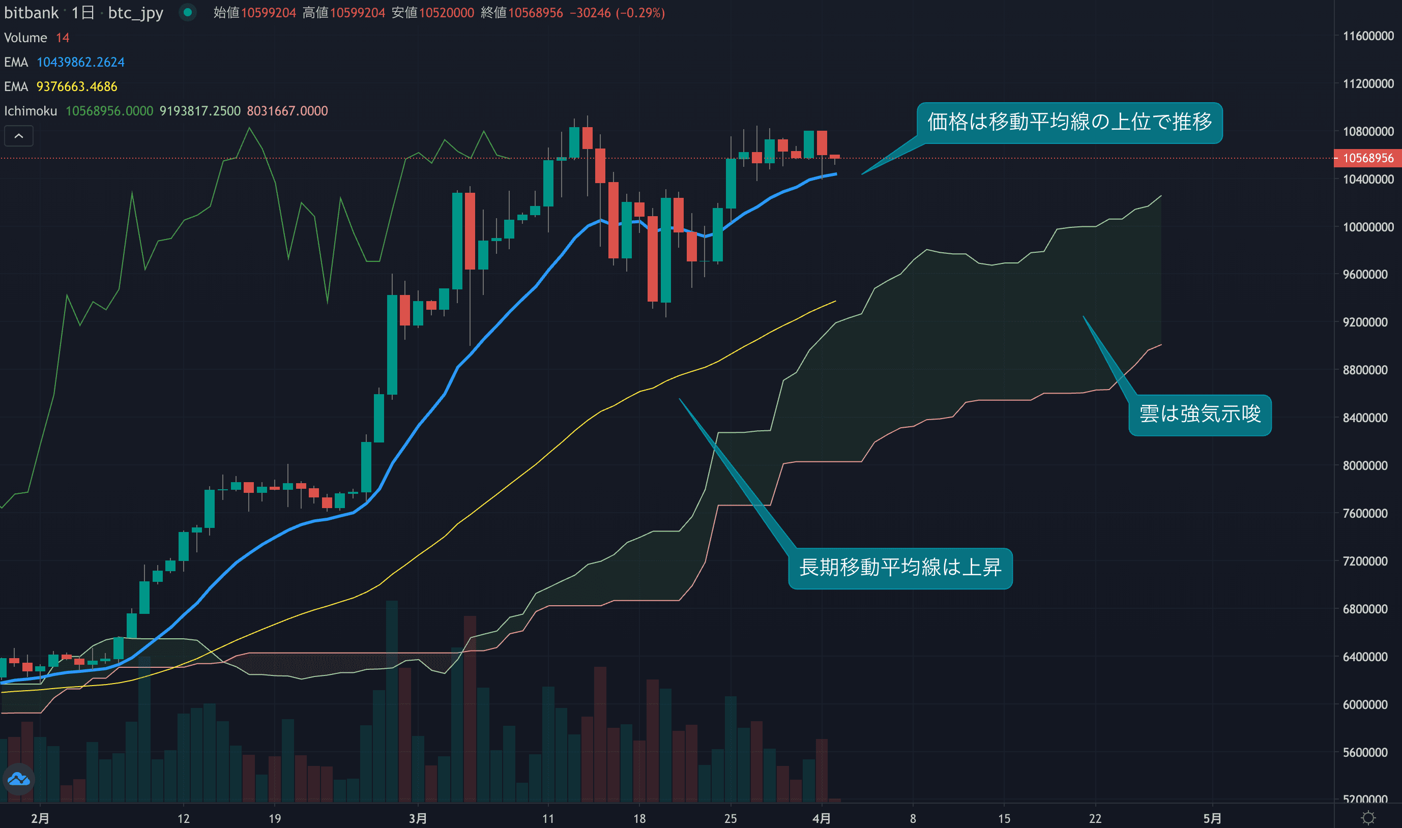 - 価格は14EMA(1042.0万円)を上回り強気示唆です。53EMA(933.0万円)は上昇しており、長期トレンドも強気です。一目均衡表の雲は先行スパン1(1017.1万円)が先行スパン2(896.4万円)を上回り強気示唆です。