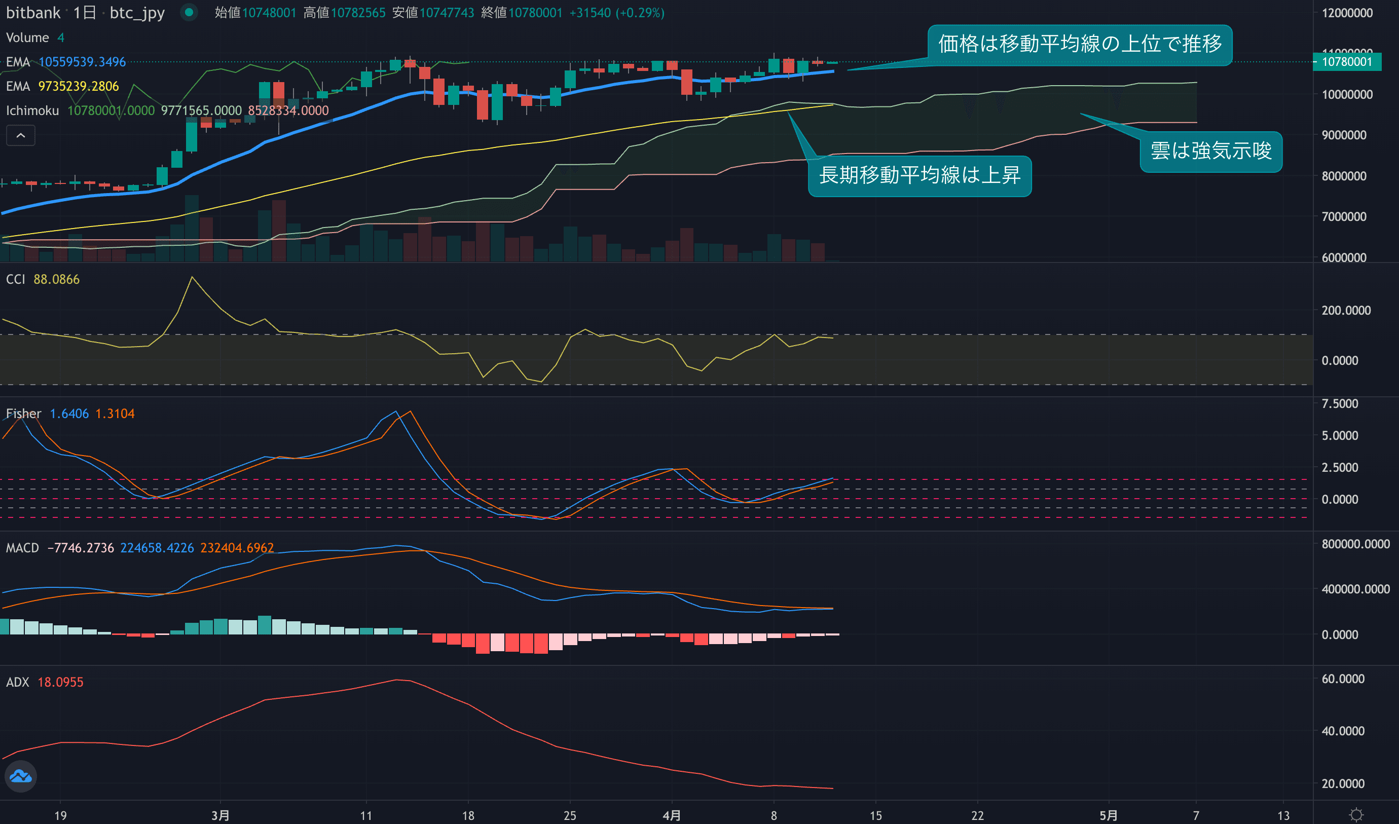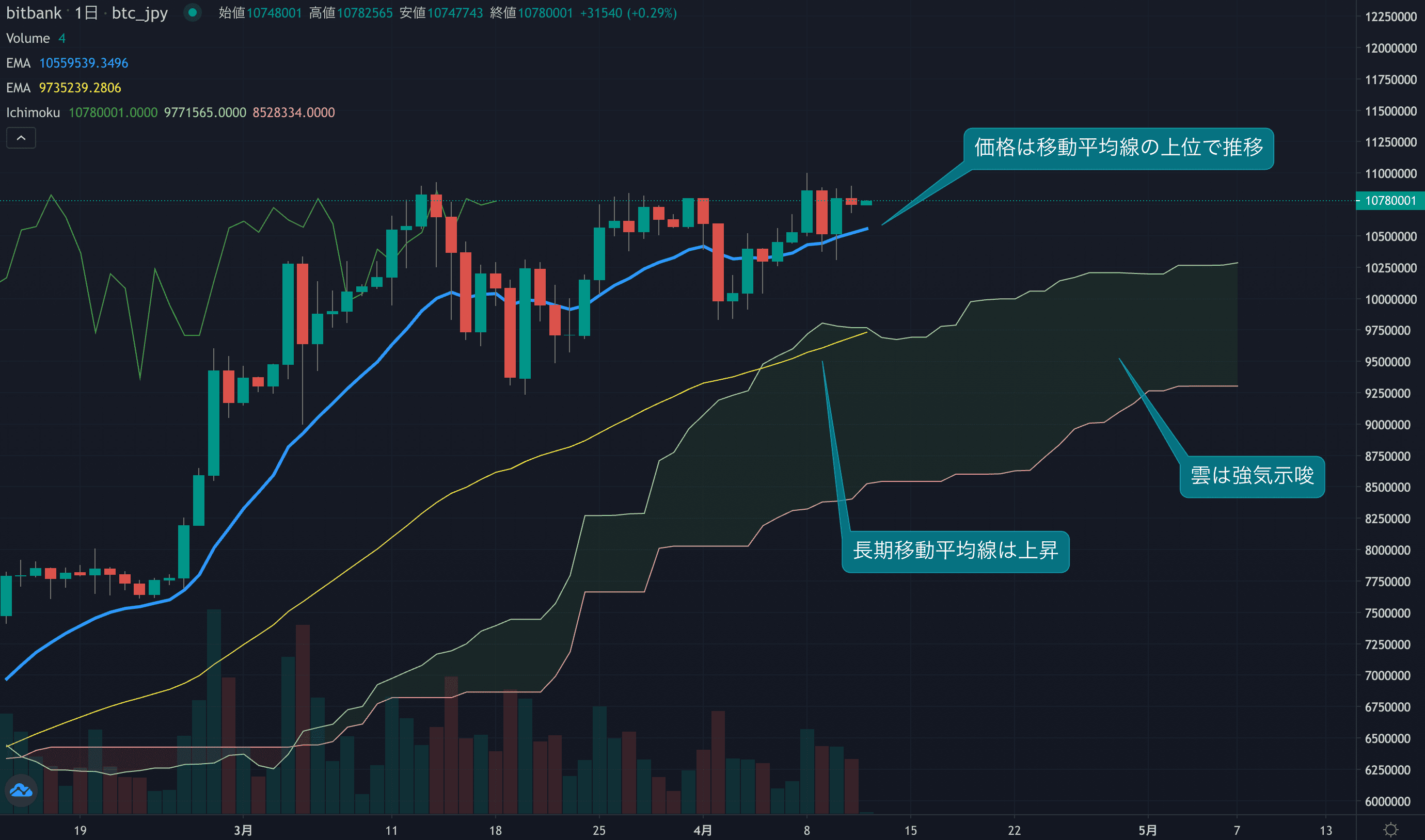 - 価格は14EMA(1052.5万円)を上回り強気示唆です。53EMA(969.5万円)は上昇しており、長期トレンドも強気です。一目均衡表の雲は先行スパン1(1027.0万円)が先行スパン2(930.6万円)を上回り強気示唆です。